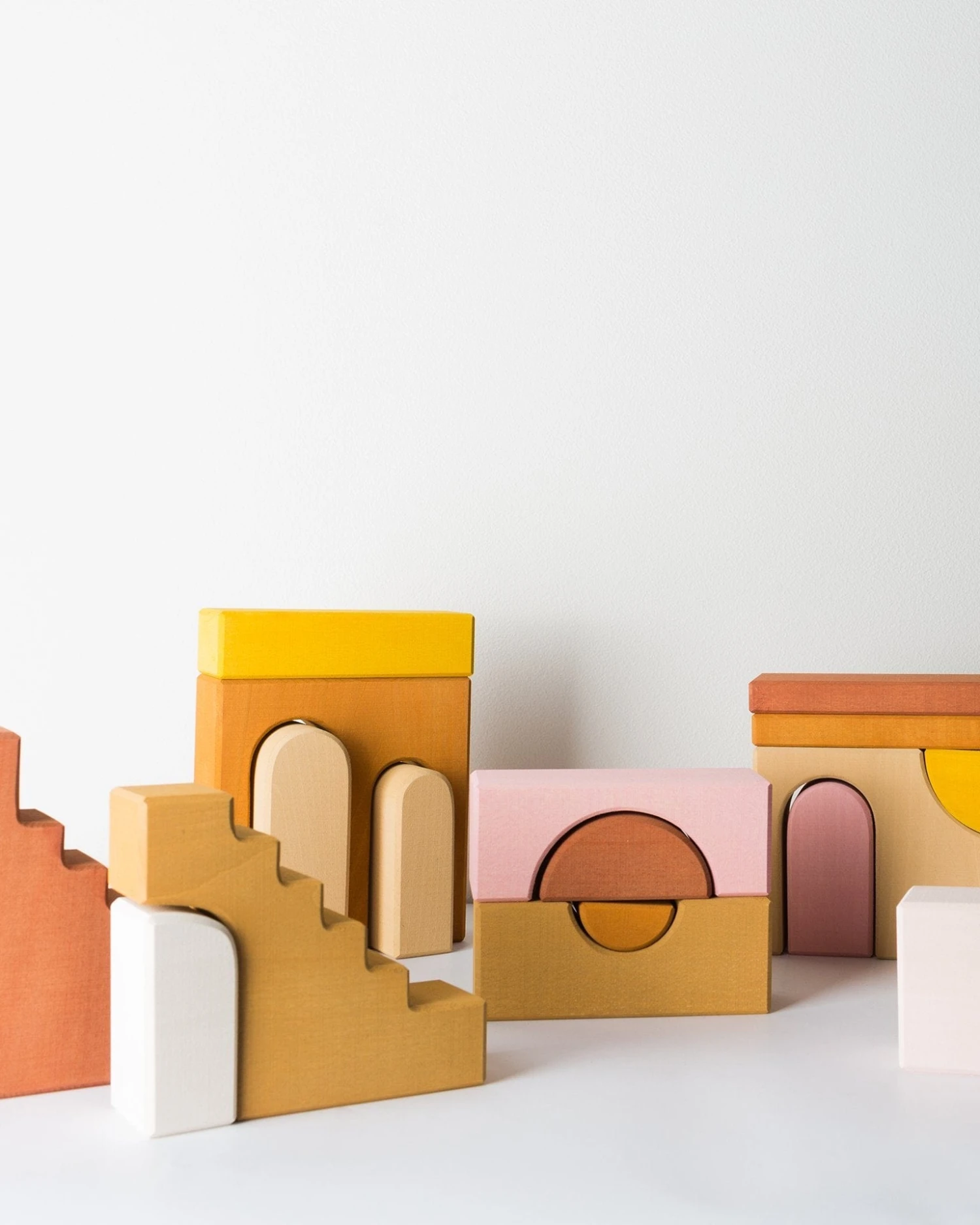 Build your own little city with the Apartment Building Blocks. With stairs, arches, triangles and more, these blocks were inspired by art and architecture. Raduga Grez is all handmade from solid wood and non-toxic waterbased paint.