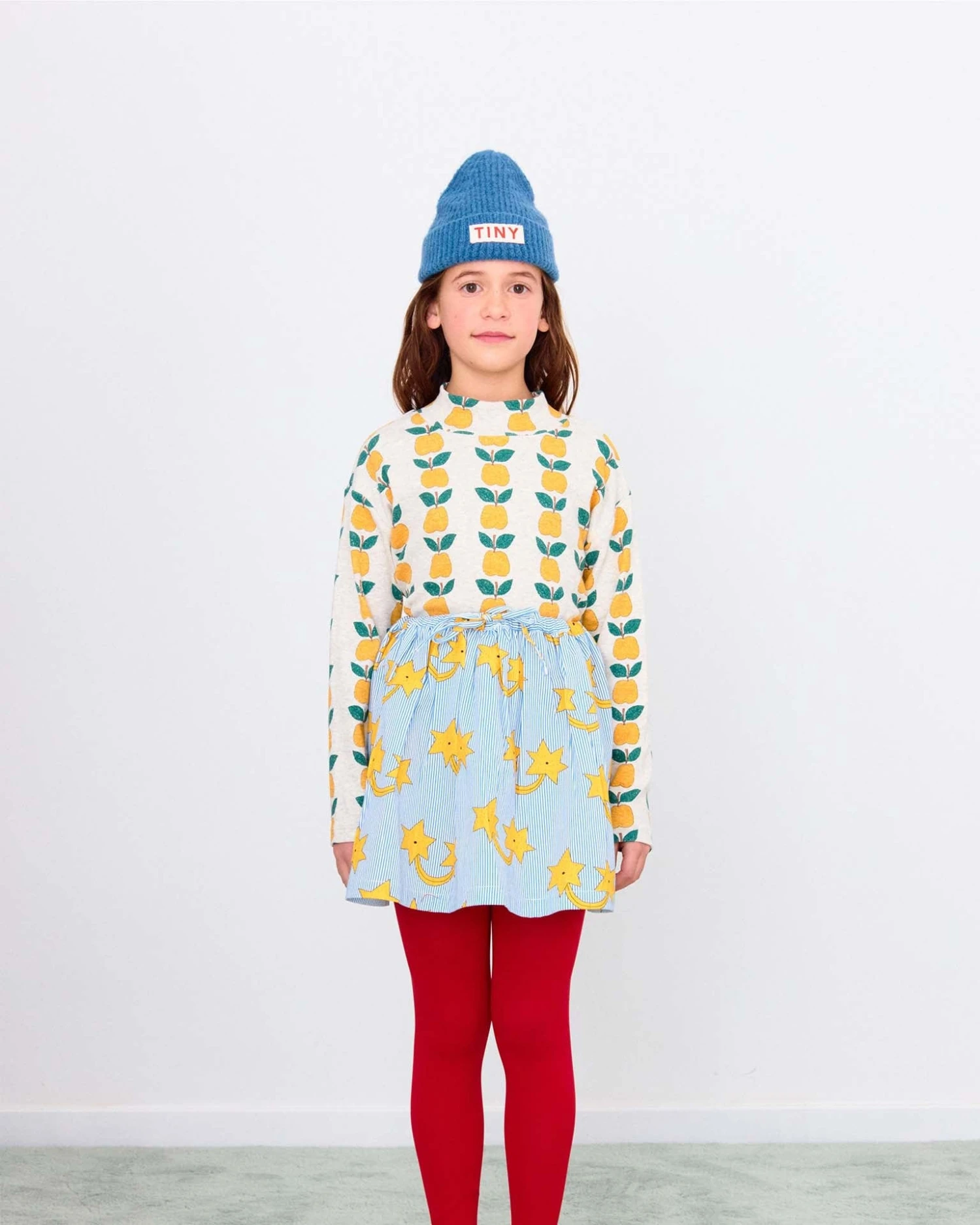 This long sleeve ribbed mockneck from Tiny Cottons features the sweetest yellow apple print! Pair this with the stripes knit skirt for a fun mix and match pattern moment.