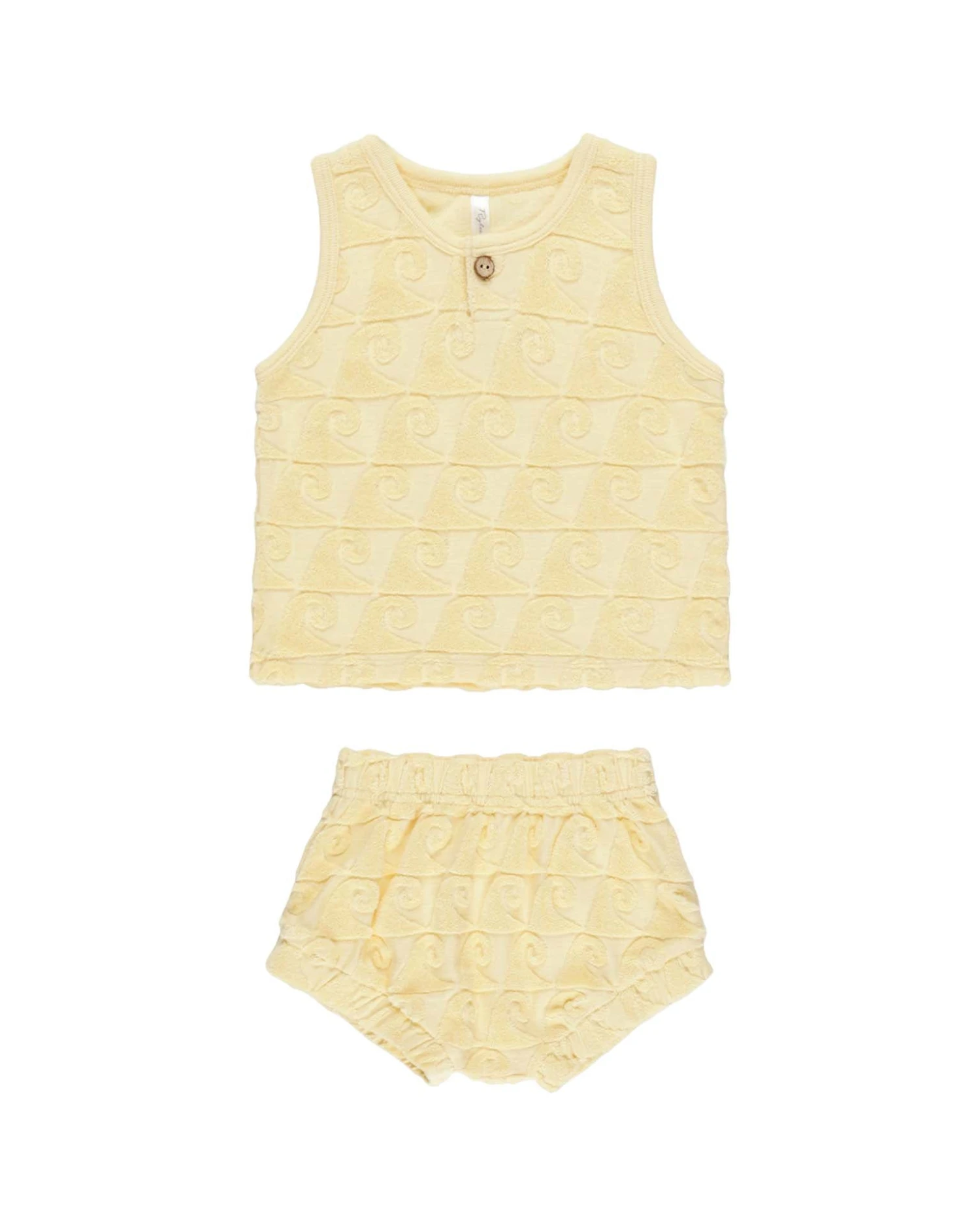 This everyday terry cloth set comes with a tank top with summary details, and coordinating bloomers with an elastic waist and legs. Enjoy sunny beach days in this retro waves look.