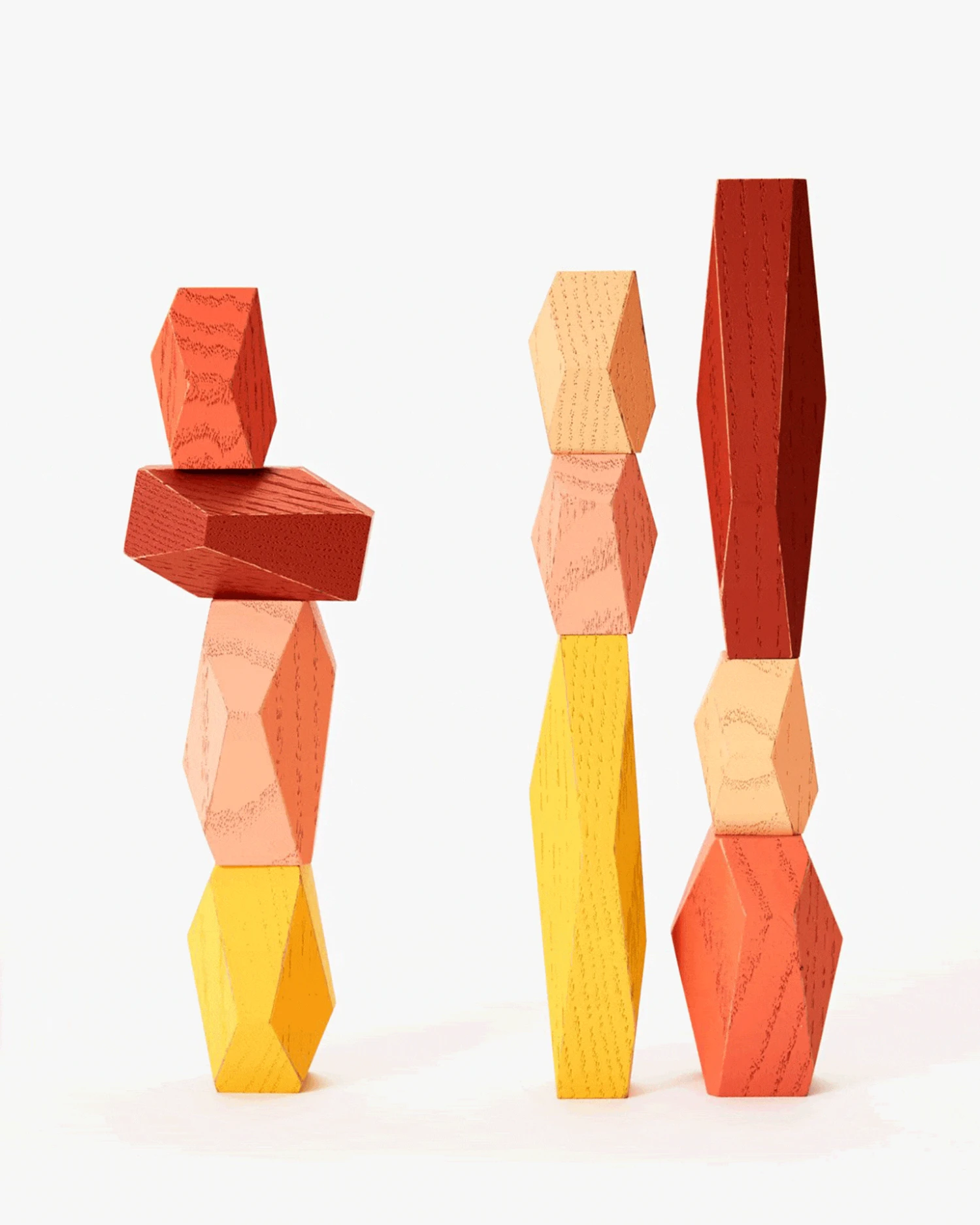 Balance these faceted stone-size shapes to create your own sculpture. This Balancing Blocks set from Areaware includes ten solid oak blocks. The blocks are coated in water-based paint and packaged in a drawstring bag.