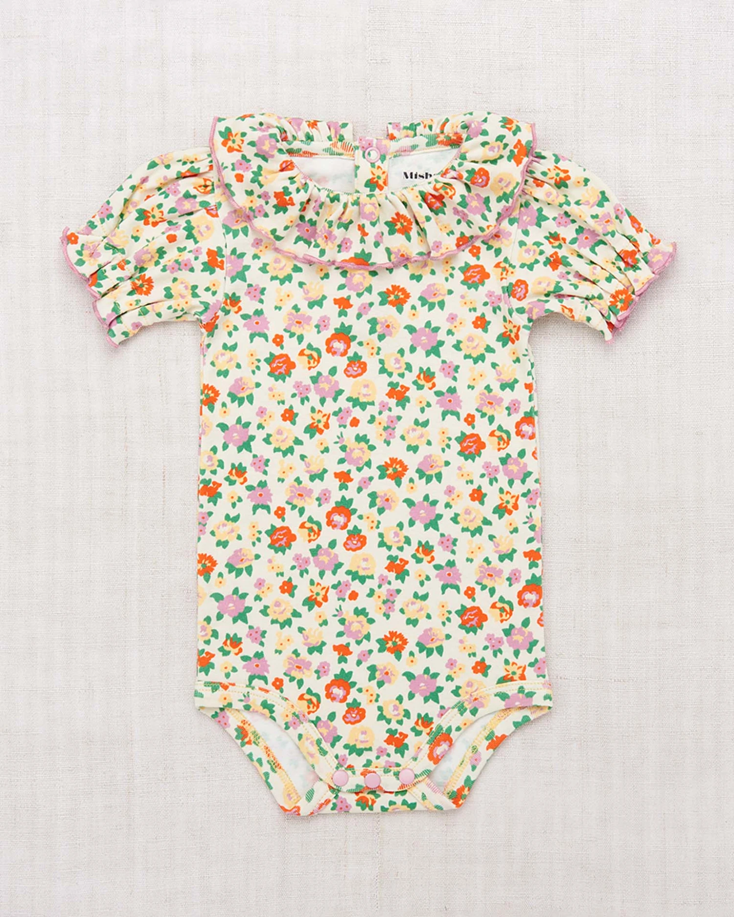 A classic puff-sleeve onesie in soft Pima cotton, featuring a gathered ruffle neck and gentle elastic ruffle cuffs with a contrast merrowed edge, and snap closures at the back neck and bottom.
