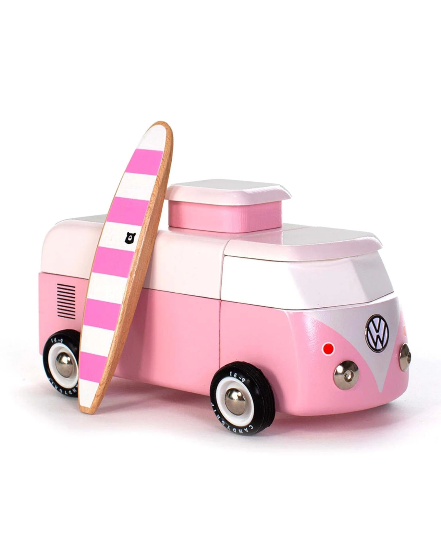 A Beach Bus three ways! The modular, magnetic construction of this Beach Bus from Candyclab allows for a 3-in-1 configuration. Each possible configuration has a distinct personality: A workhorse pick-up, a Beach Surf van or a Camper pop-top. Each Beach Bus comes with a unique magnetic surfboard that complements its colorway. It magnetically snaps to the roof or flatbed of the truck.