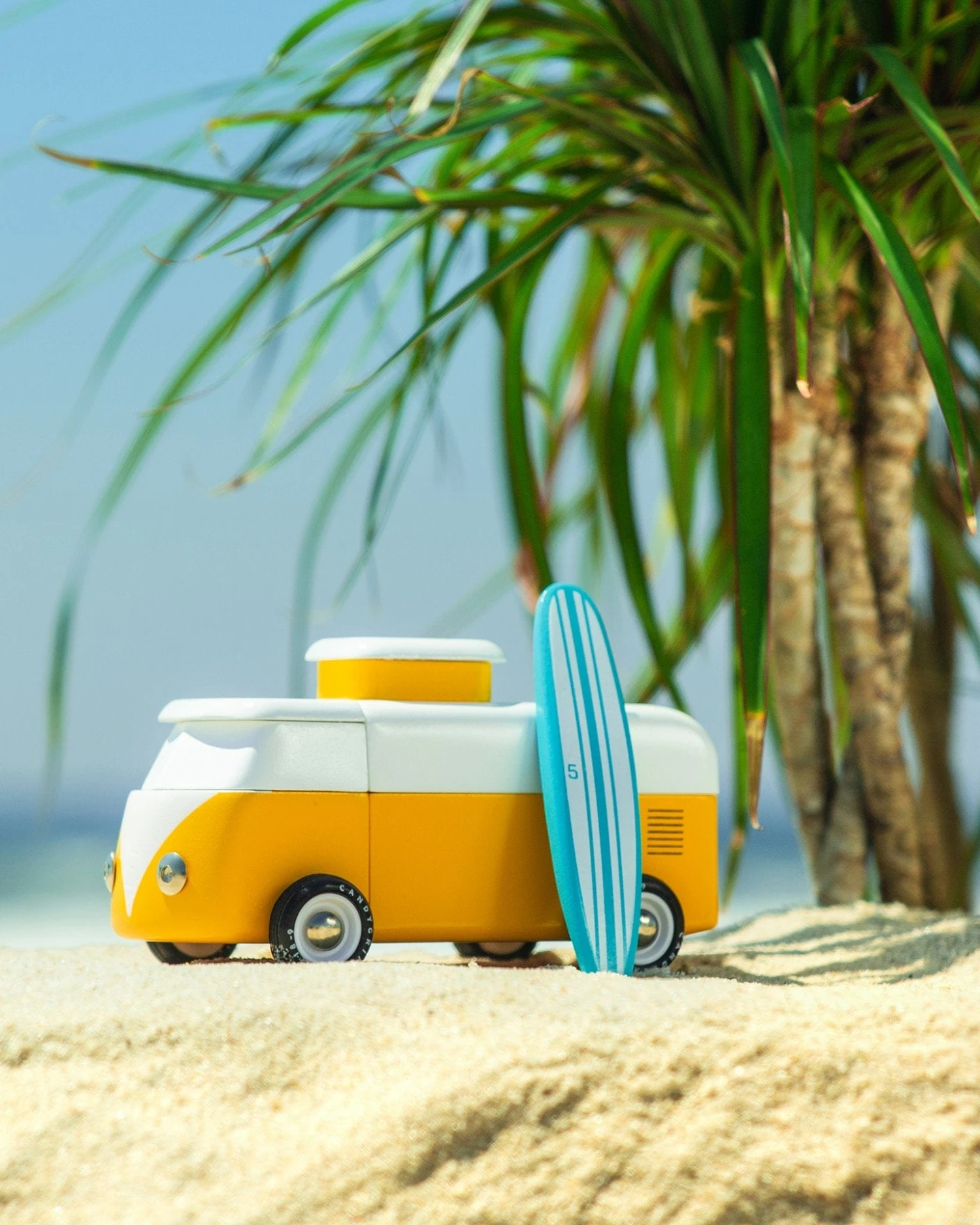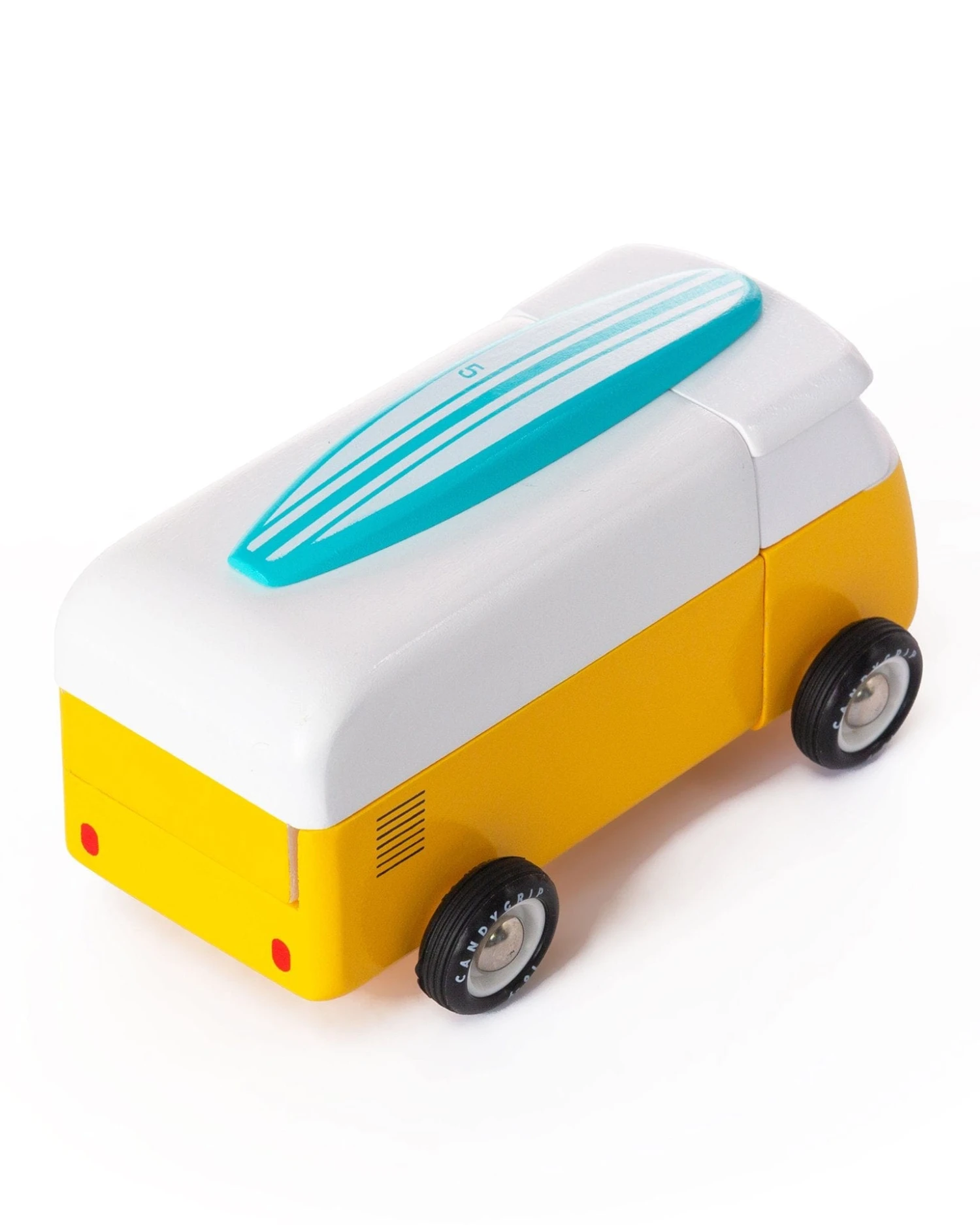 A Beach Bus three ways! The modular, magnetic construction of this Beach Bus from Candyclab allows for a 3-in-1 configuration. Each possible configuration has a distinct personality: A workhorse pick-up, a Beach Surf van or a Camper pop-top. Each Beach Bus comes with a unique magnetic surfboard that complements its colorway. It magnetically snaps to the roof or flatbed of the truck.