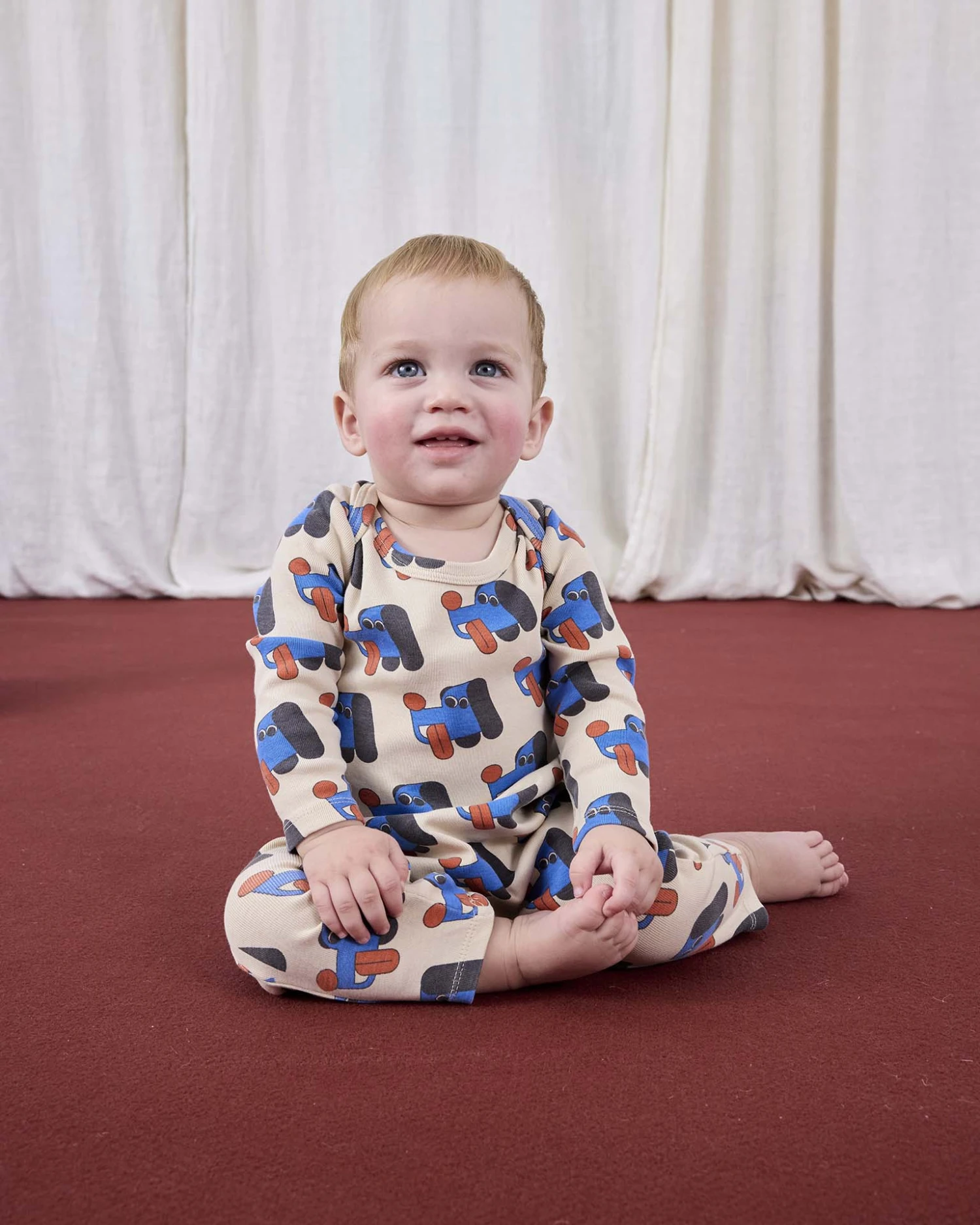 We love this long-sleeved one-piece from Bobo Choses. With the fun new doggy mate print, and snap summarys for easy changing.
