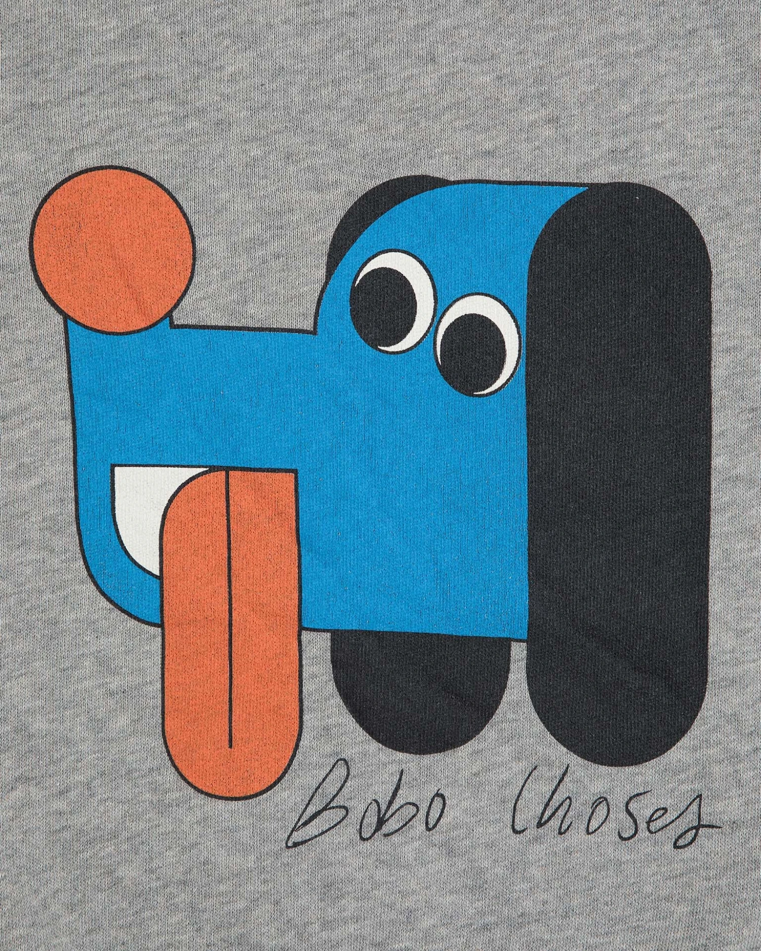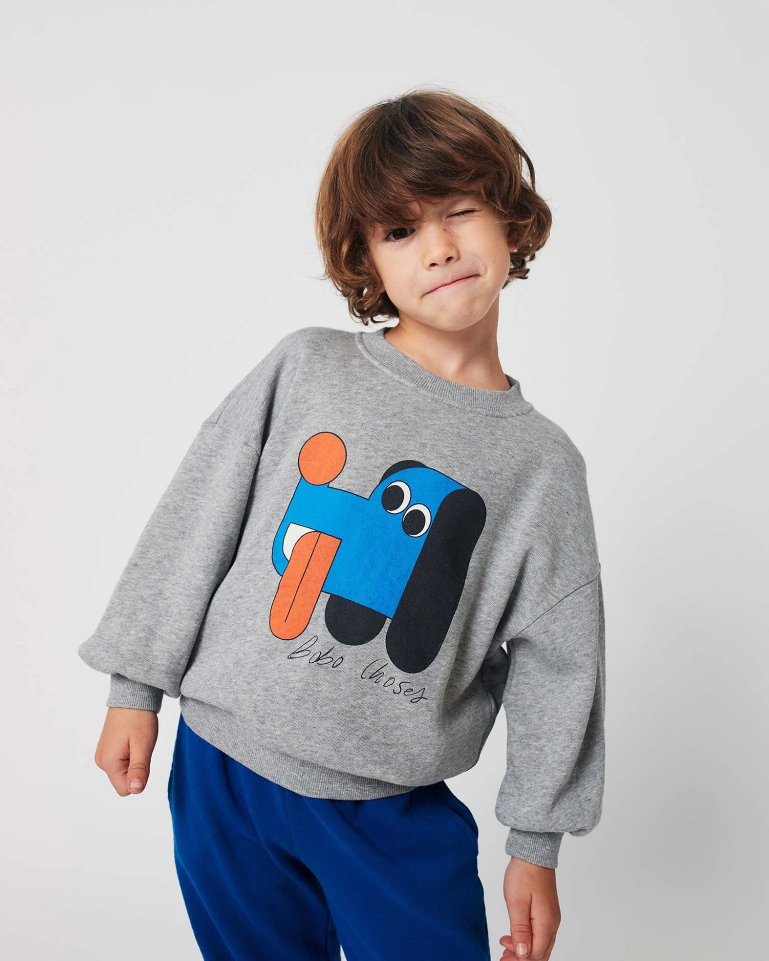 This sweatshirt features the Bobo Choses doggy mate logo on a soft organic cotton crewneck in heather gray. Pair it with the doggy mate all over leggings or some Bobo corduroy pants!