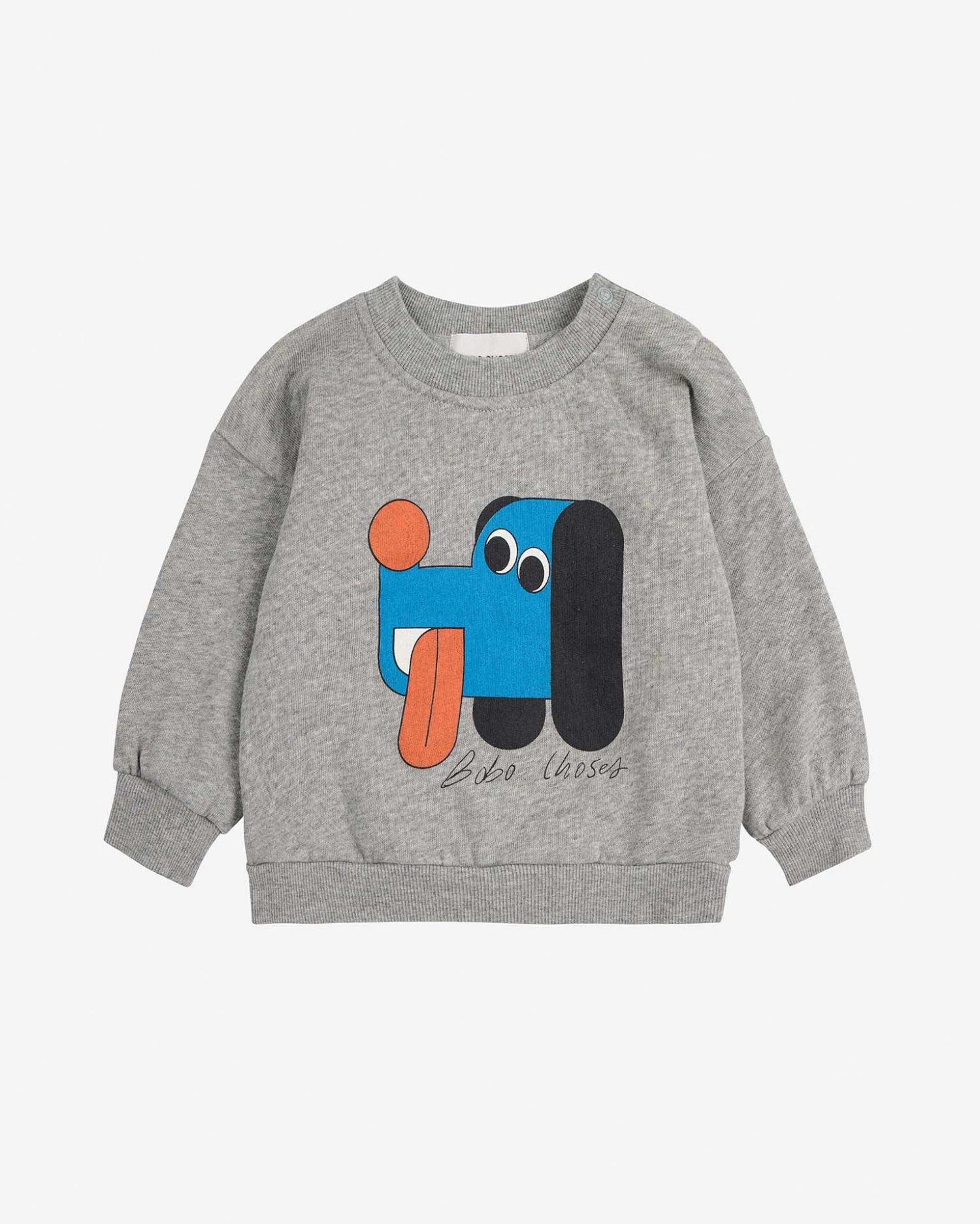 This soft 100% organic cotton crewneck from Bobo Choses is one of our favorites from the collection. Featuring a classic light heather grey color, the iconic doggy mate graphic, and a comfy oversized fit. Pair this sweatshirt with any pair of joggers or leggings for a cute mix and match look.