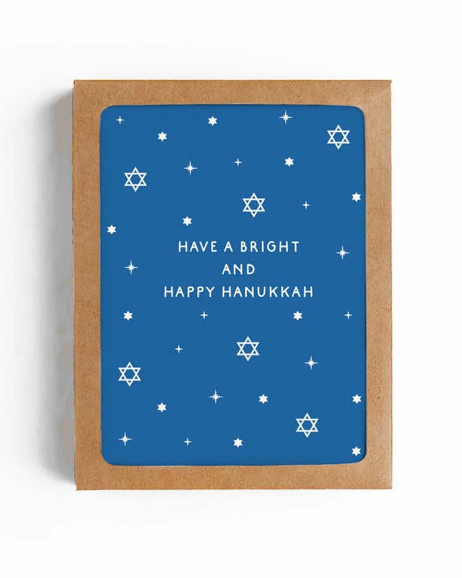 A modern Hanukkah card with stars to make your Hanukkah Bright and Happy! Designed and printed in USA on matte felt stock. Blank inside for your lovely personal message.