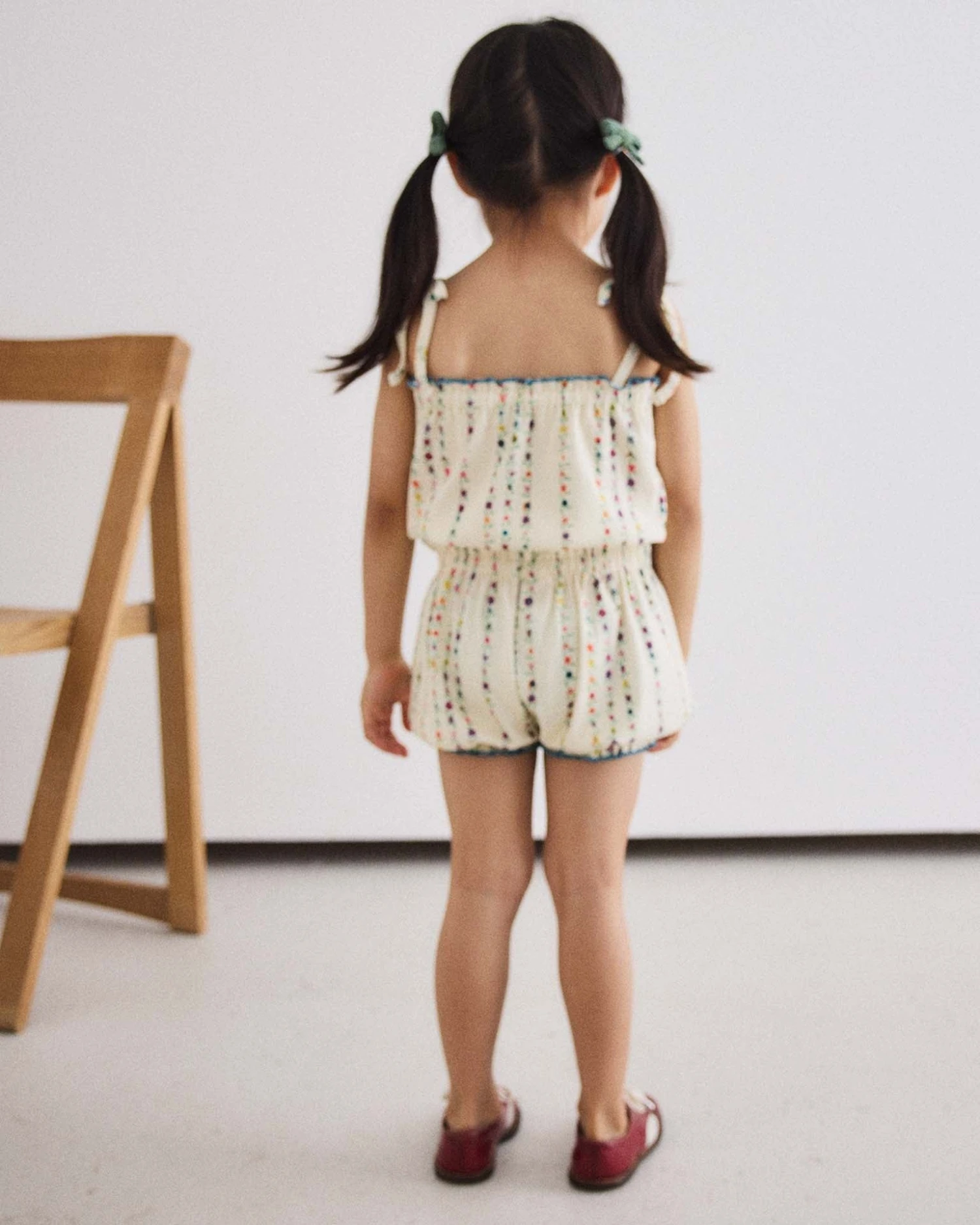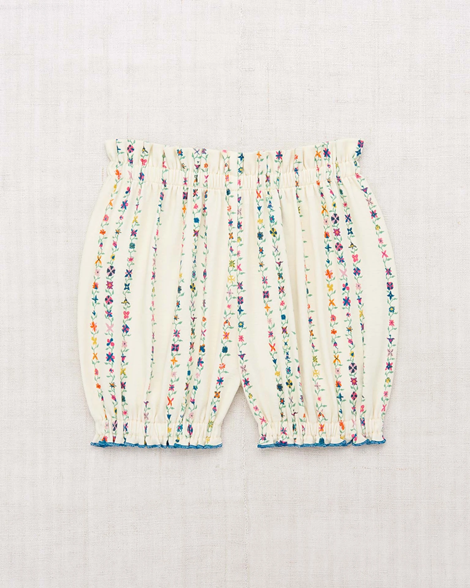 A pull-on bloomer in Pima cotton, featuring a cinched ruffle elastic waist and leg opening with a contrast merrowed edge.
