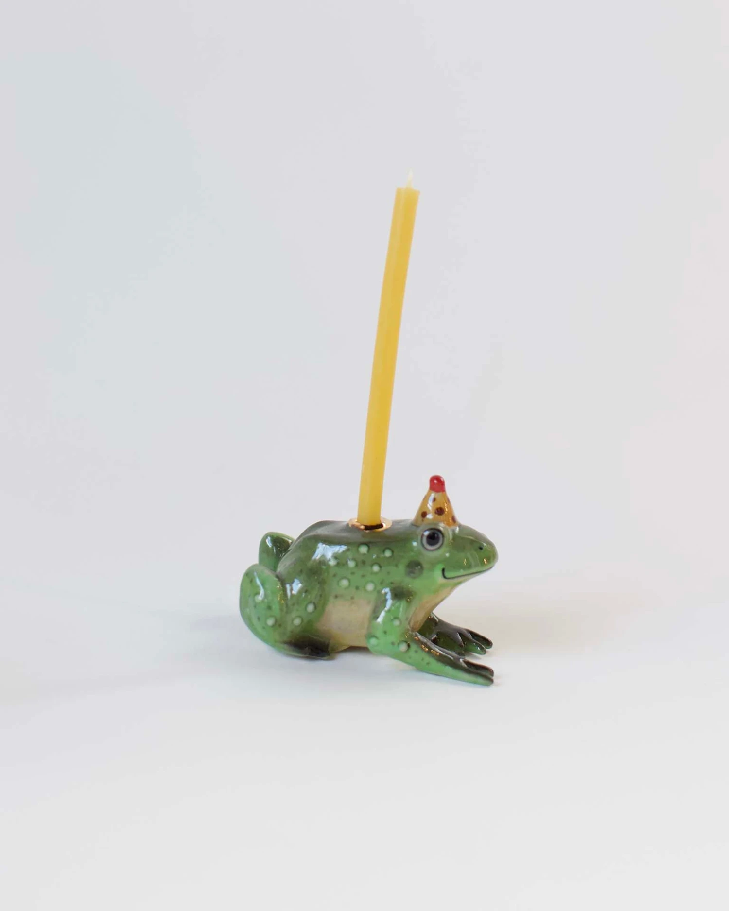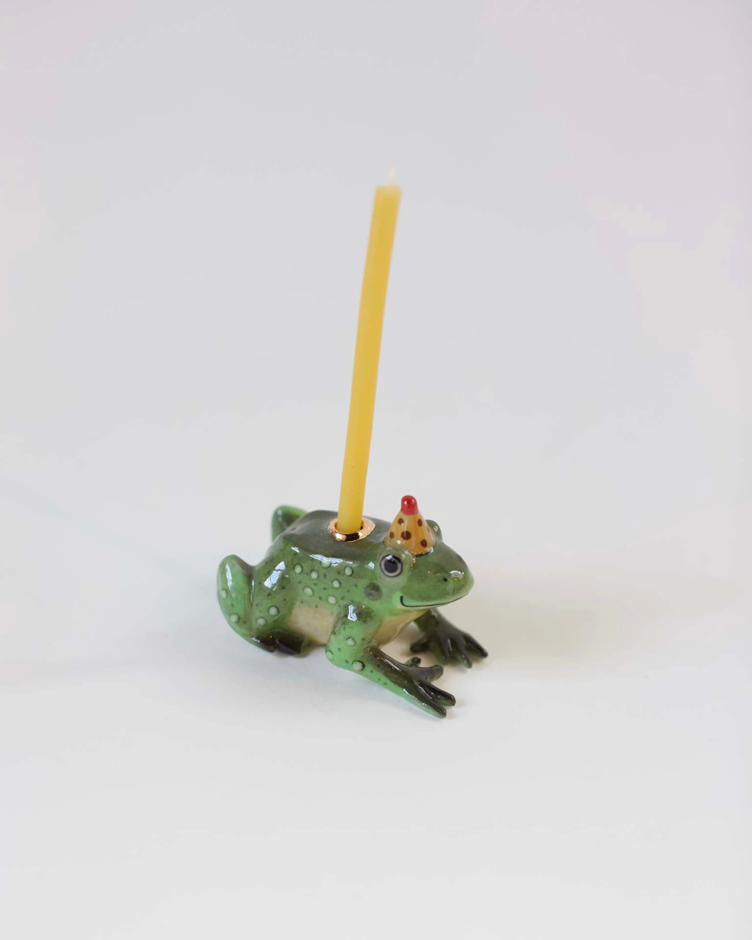 Celebrate with a little whimsy with this ceramic Charming Frog Cake Topper from Camp Hollow. This hand-painted candle holder is the perfect accessory for that sweet special occasion. With heirloom-quality craftsmanship, this frog is sure to be a treasured family keepsake. Party on!