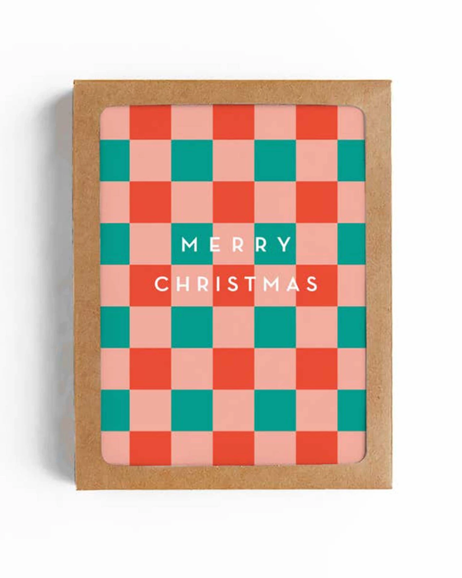 A modern checkerboard pattern in classic colors to wish a Merry Christmas. Designed and printed in USA on bright white matte felt stock. Blank inside for your lovely personal message.