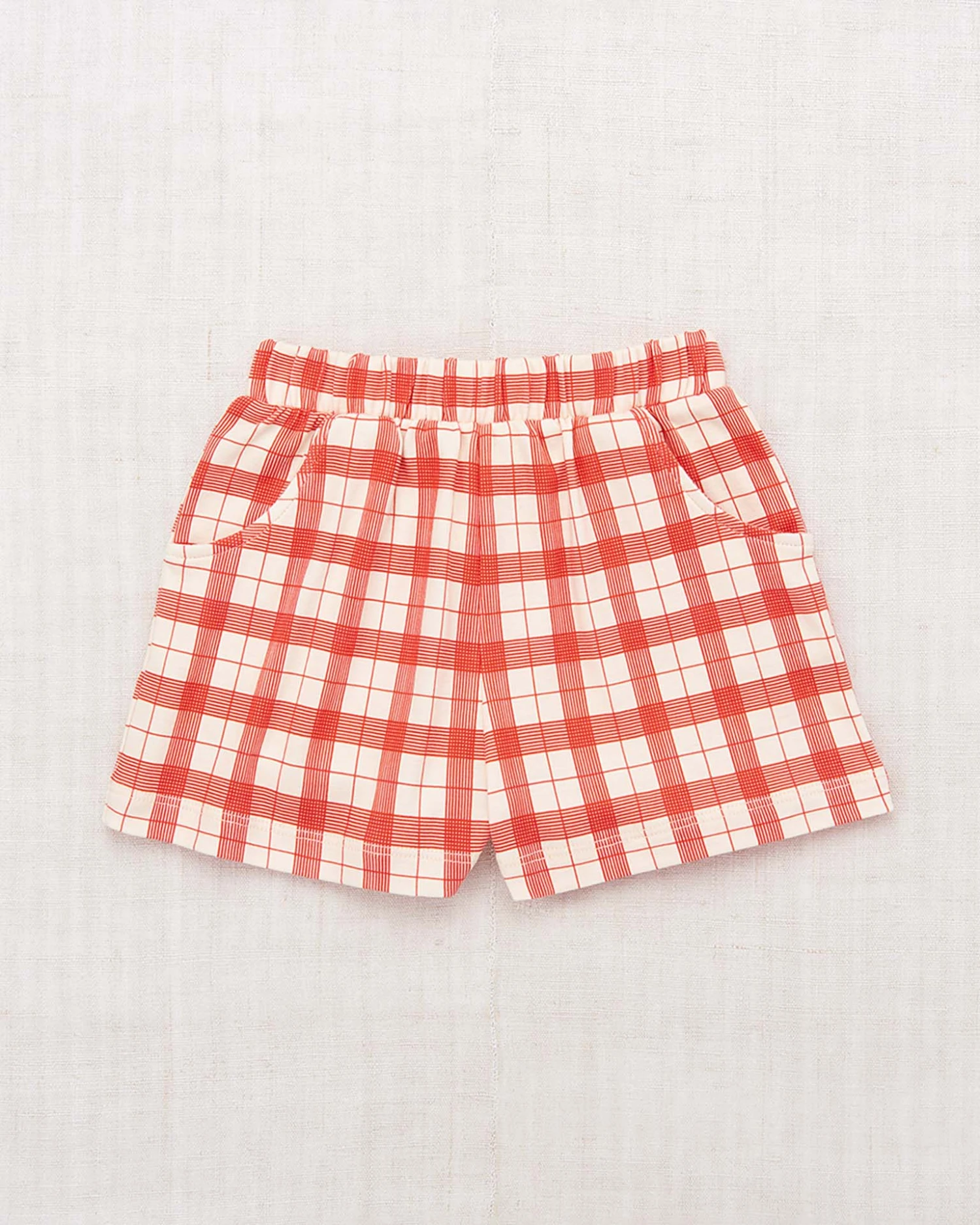 A relaxed vintage-style pull-on short in Pima cotton, with a gathered elastic waistband and curved pockets.
