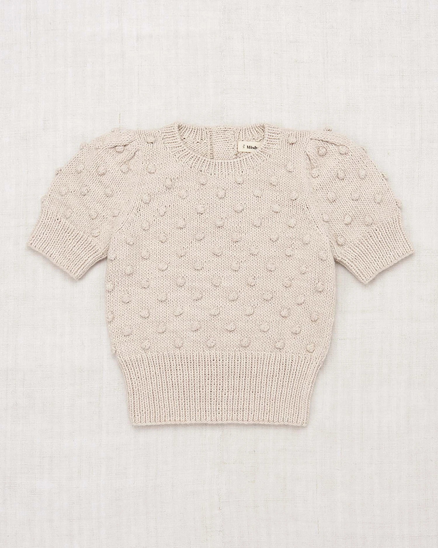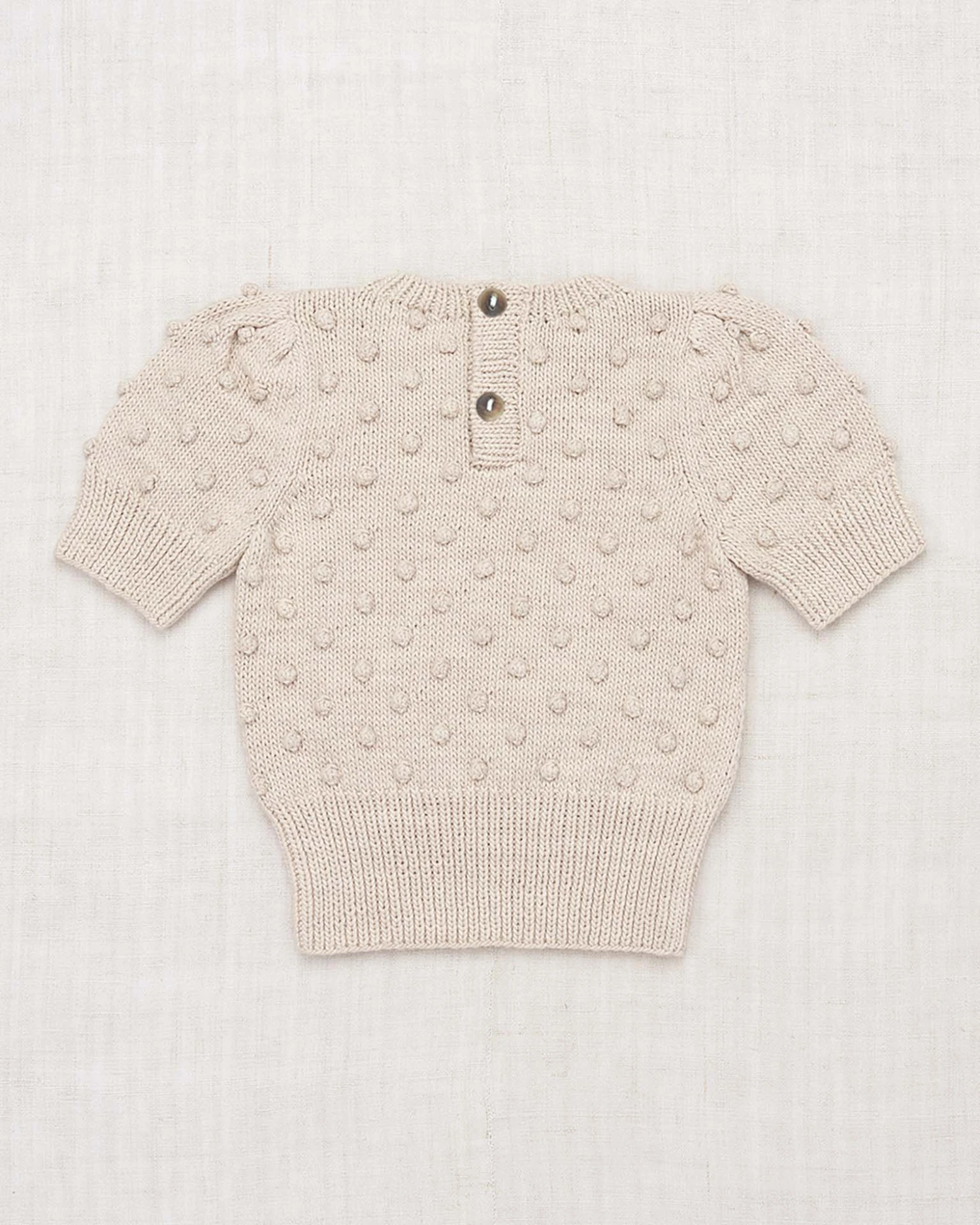 Misha & Puff’s signature all-over popcorn stitch in a short sleeve pullover, heavier-weight Pima cotton knit. With puff sleeves, a rounded neckline, and tall ribbed cuffs and hem. This piece is intended to have a more fitted body that sits at the natural waist, with horn summary closure at the back neck.