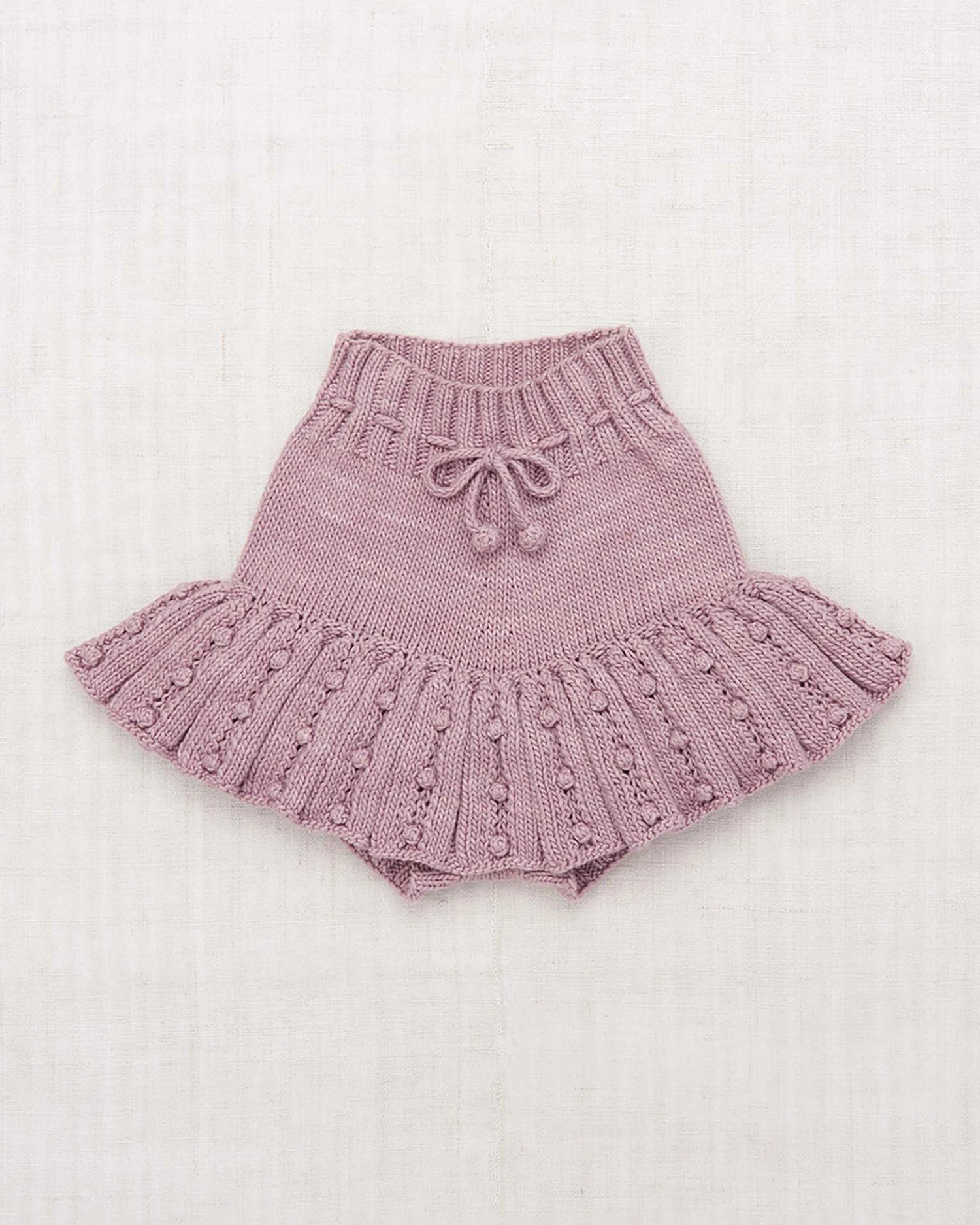 A hand-knit skirt in Pima cotton. Featuring attached bloomers with ribbed cuffs, eyelet popcorn stitch details, and a ribbed waistband with a popcorn tie drawstring for a secure fit. The hand-dyeing process of our yarn introduces beautiful variations and subtle nuances, making each garment truly unique.