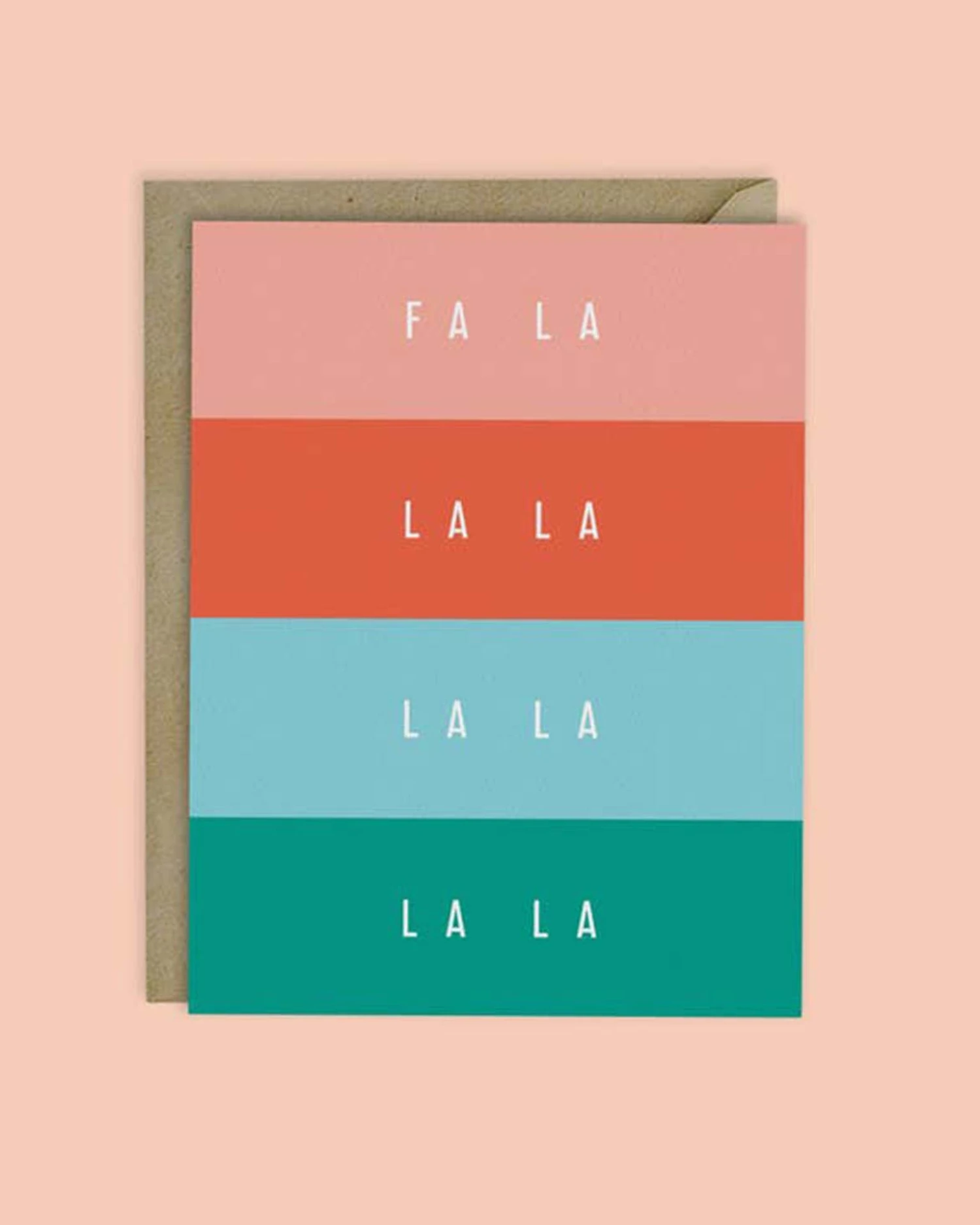 A modern Fa La La La Christmas card in a color block stripe in fresh holiday colors. Designed and printed in USA on bright white matte felt stock. Blank inside for your lovely personal message.