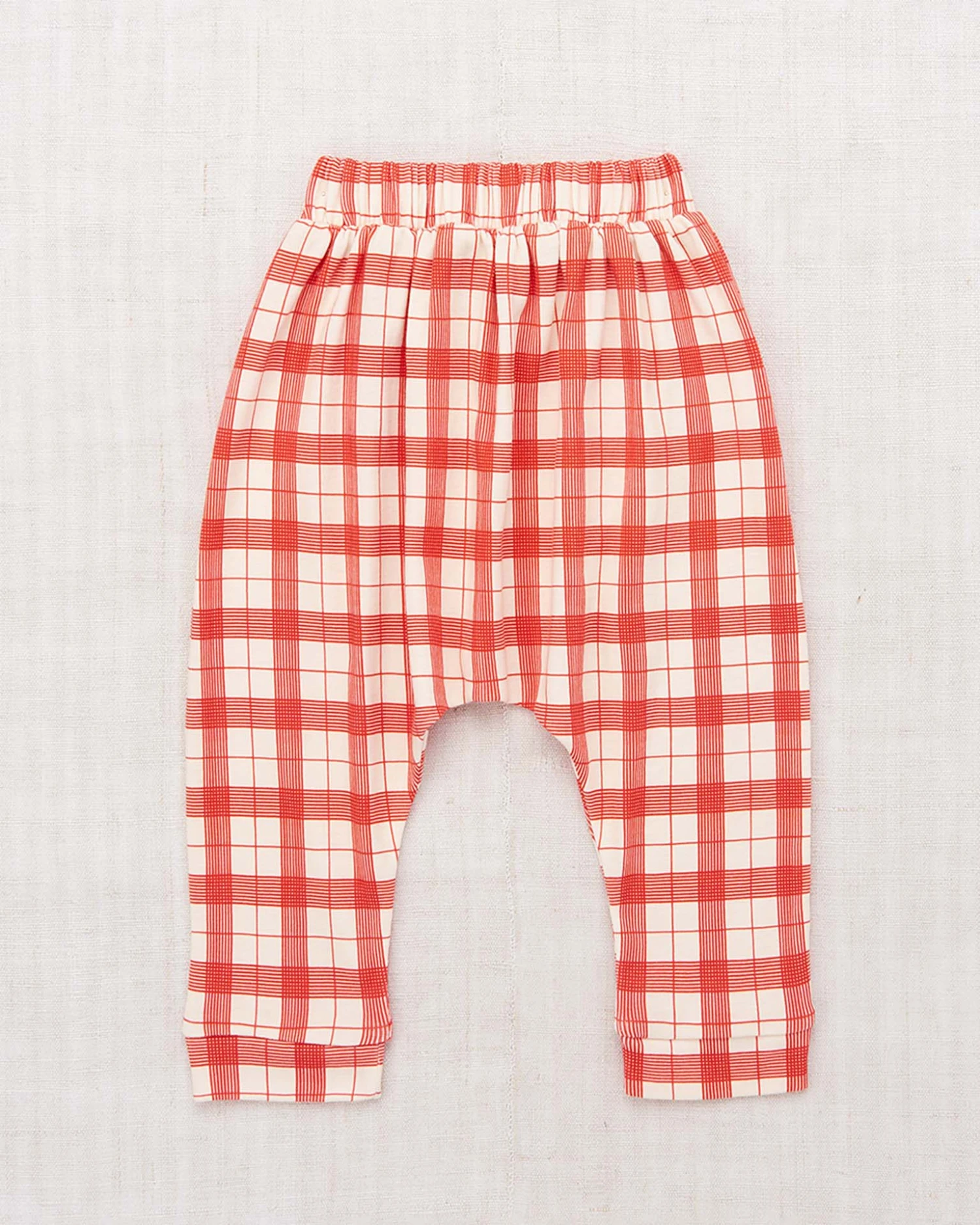 A roomy pull-on pant in soft Pima cotton, with a gathered elastic waistband and cuffs at the hem.
