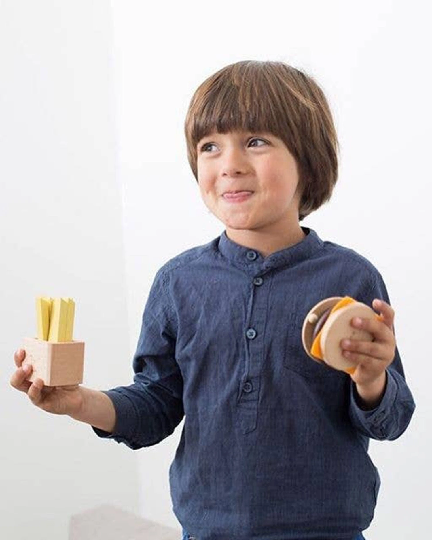 Burger fans rejoice! Your little ones can now eat all of the fast-food they want with this healthy wooden burger n’ fries set! This Musical Hamburger Set from Kiko+ GG is fun for a play kitchen all for their next musical performance. Click the burger for some maracas fun and shake those fries!