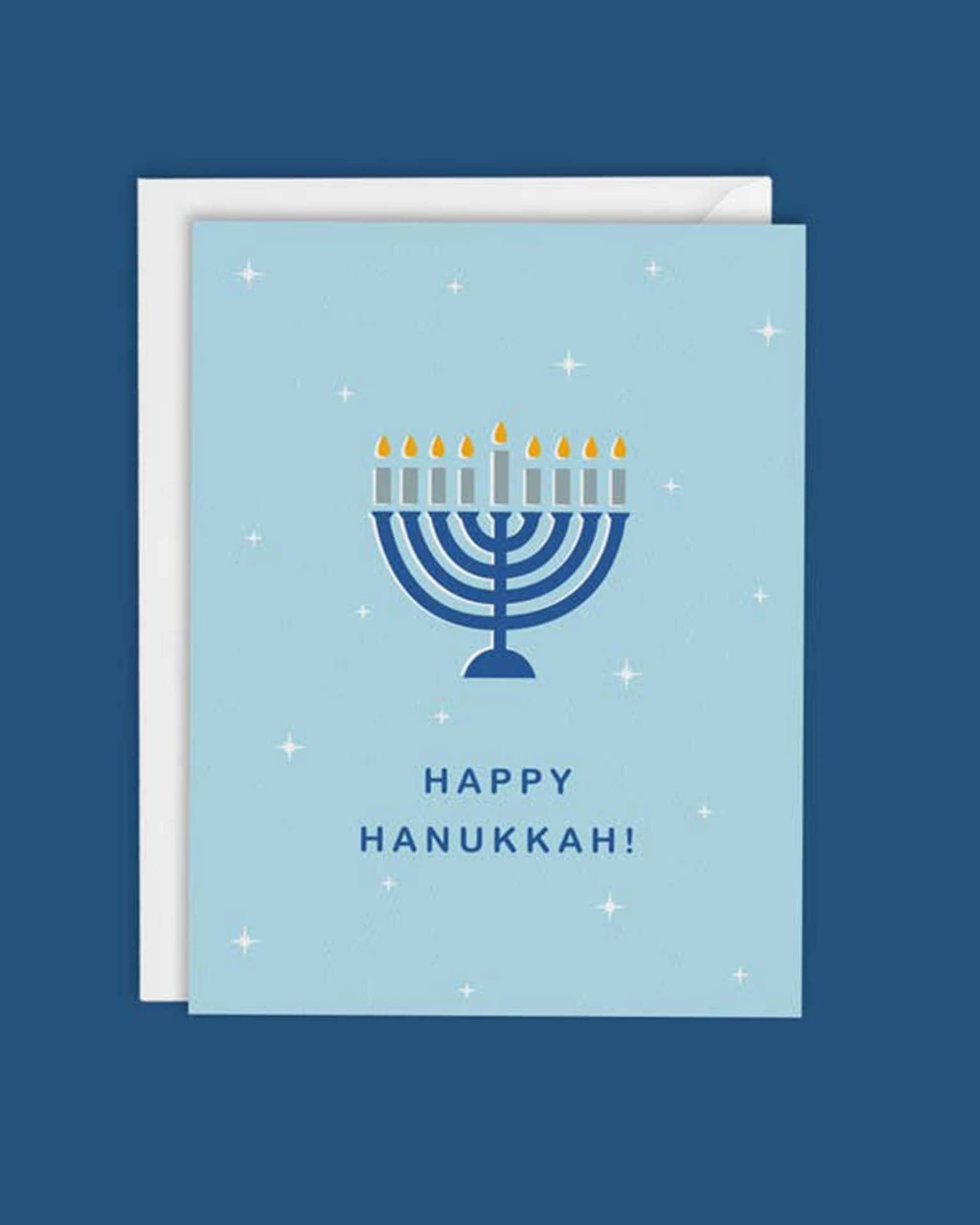 A modern Happy Hanukkah card with a simple illustration of a Menorah. Designed and printed in USA on matte felt stock. Blank inside for your lovely personal message.