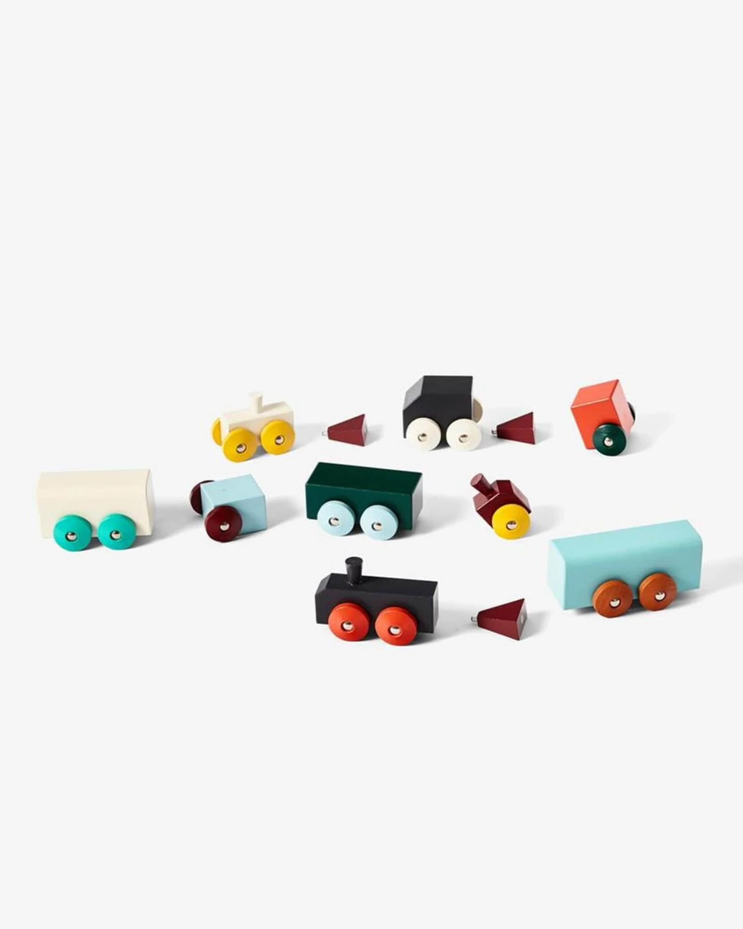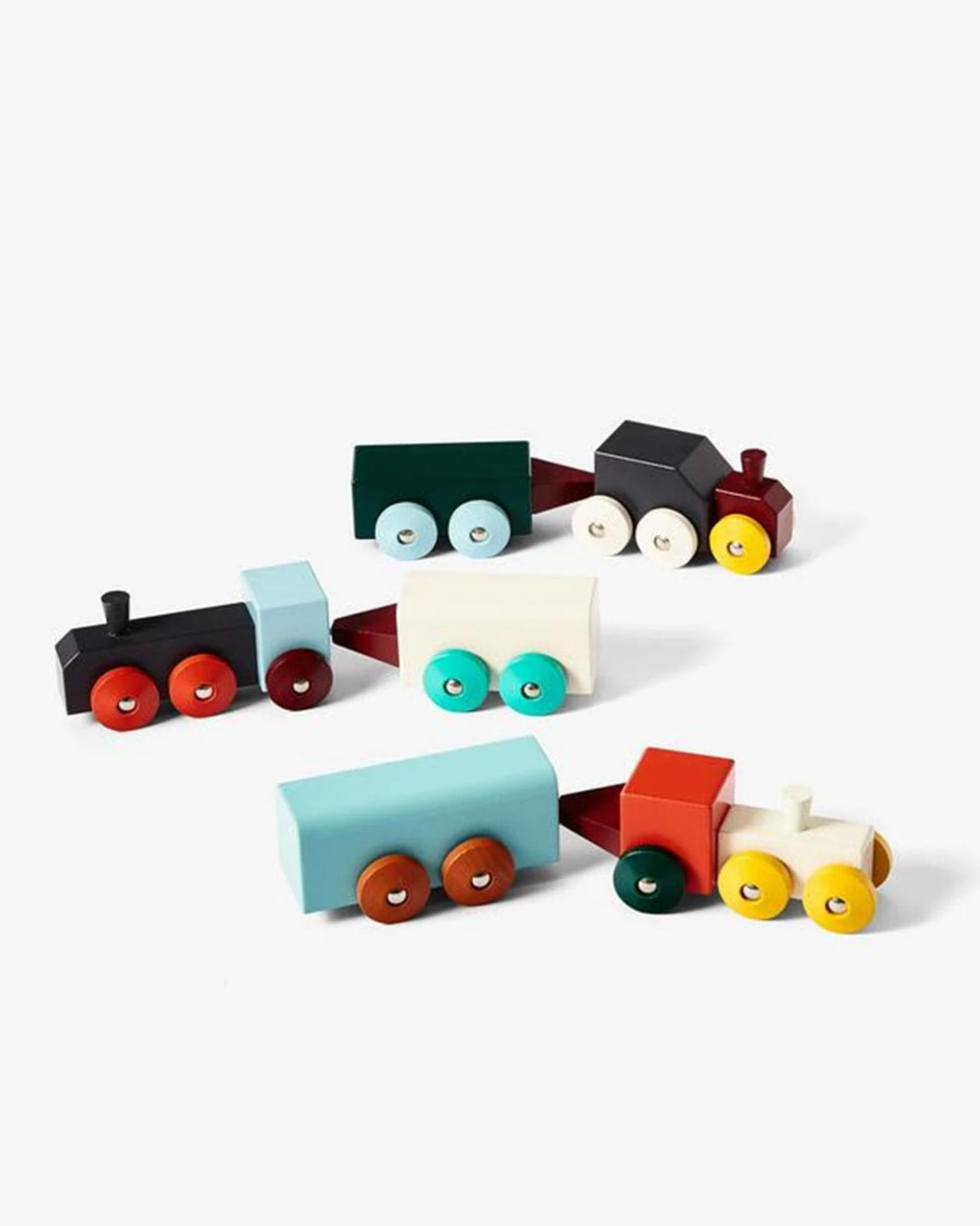 Hovers Trains from Areaware are crafted from contemporary shapes and painted in bright colors—a simple design that celebrates locomotives and the innovation, perseverance, and creativity they brought to the world. Join the train engines and cars by their embedded magnetic connectors to create your own playful arrangements.