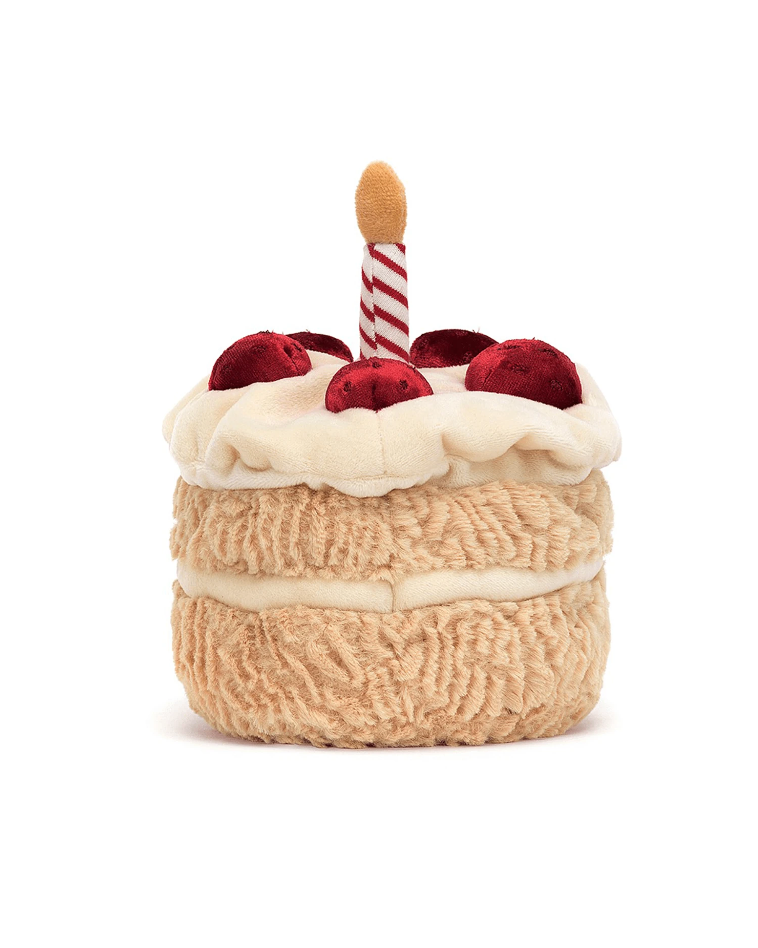 Amuseable Birthday Cake is snuggly-scrumptious, with tussly fur so beautifully baked. This party poppet wears a squashy hat of heavenly splodgy buttercream, topped with velvety strawberries and a striped jersey candle. Kick up those cordy boots and let’s celebrate!