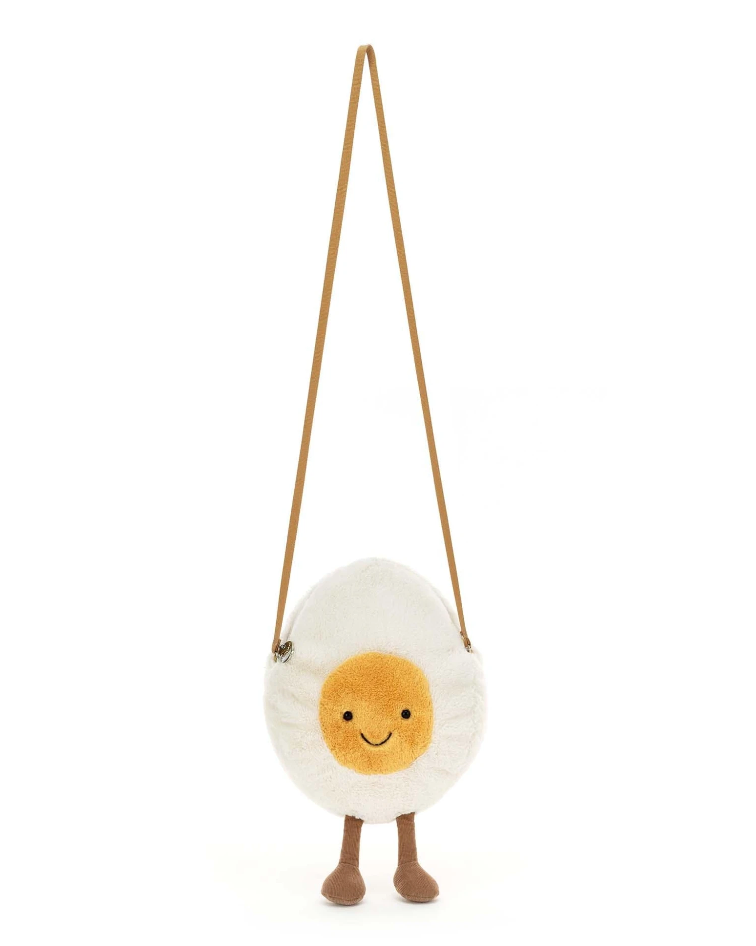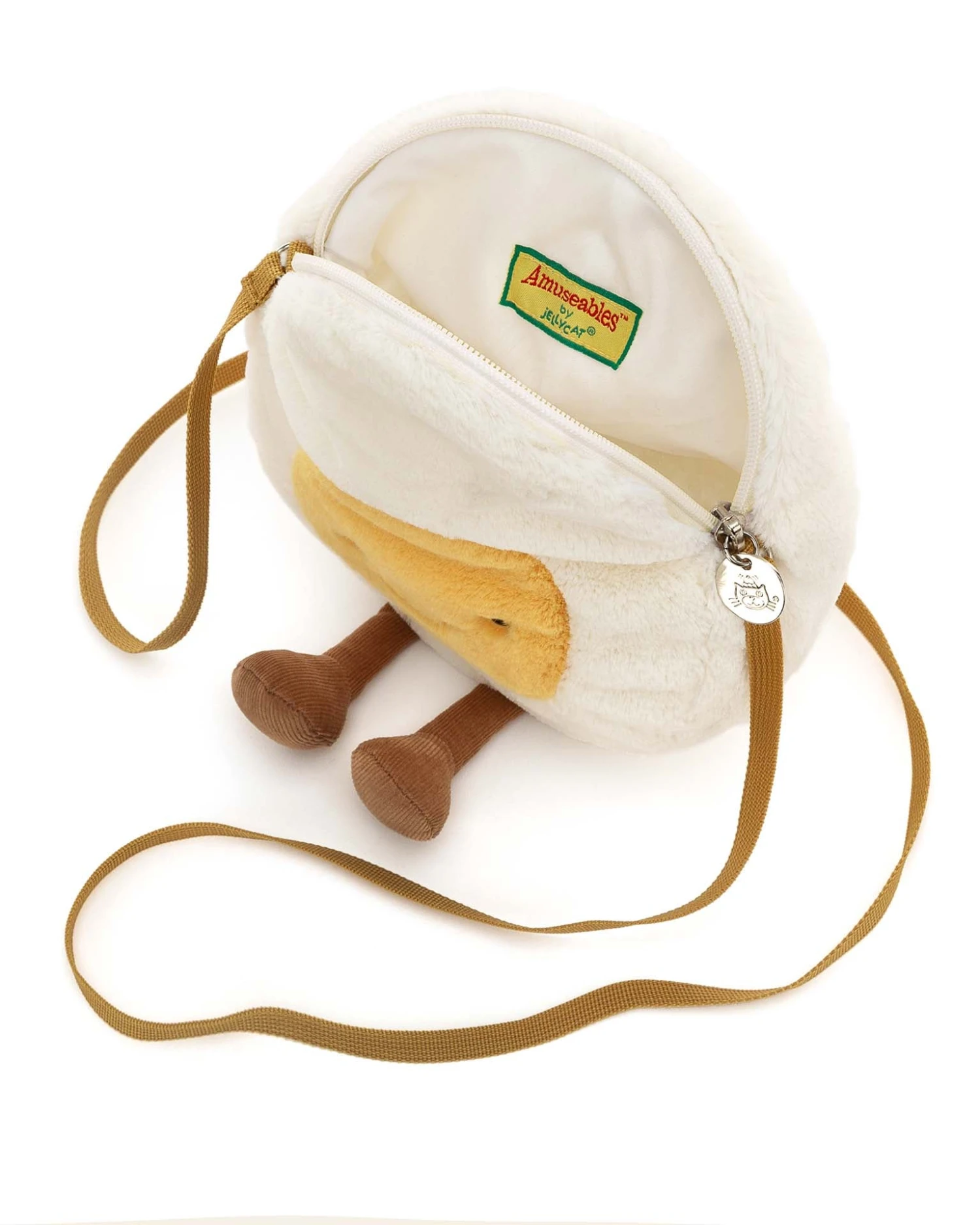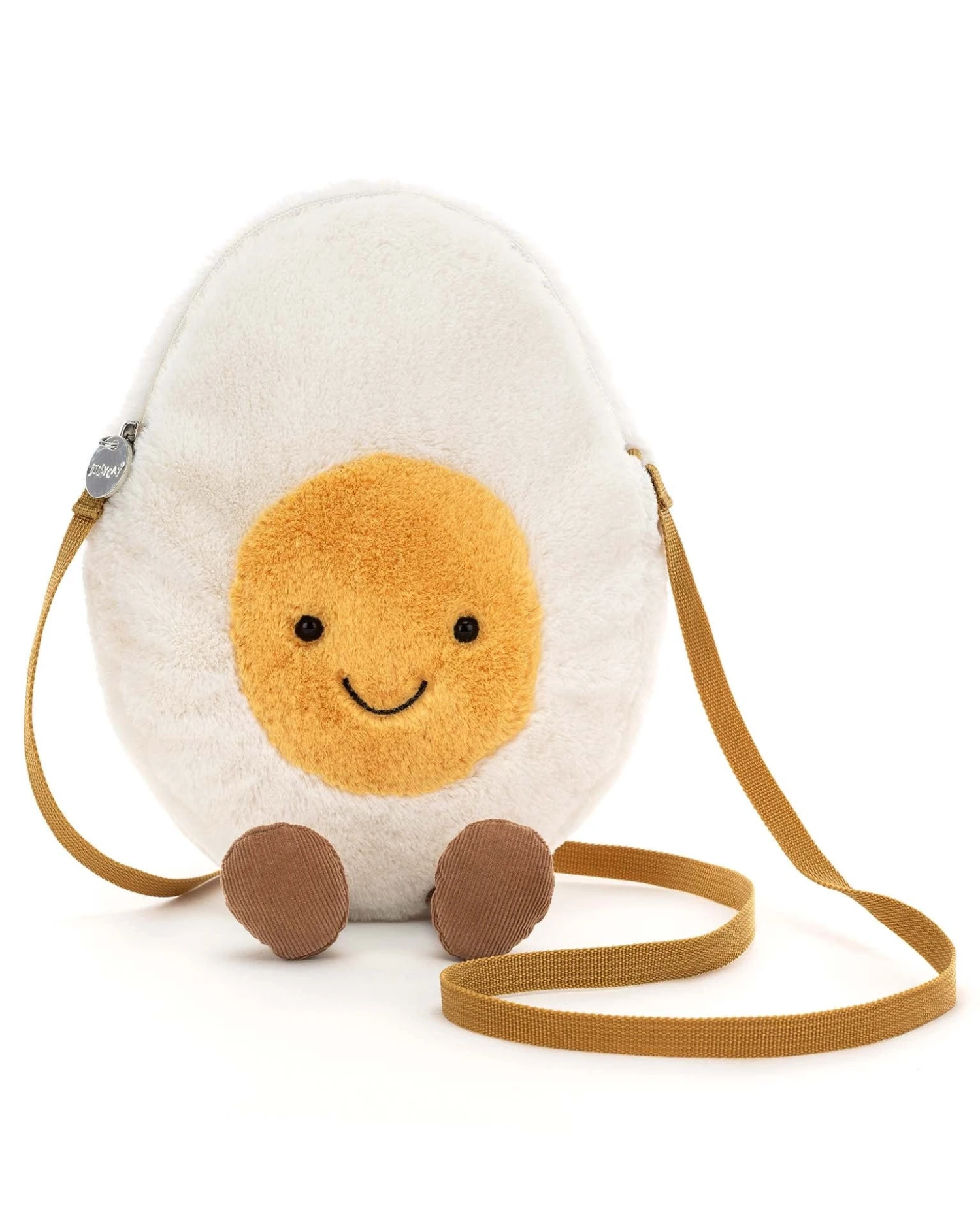 Amuseable Happy Boiled Egg Bag is one chipper champ! Smiley and sunny, with a strong mustard strap, soft white fur and a gorgeous golden yolk, this egg likes to dangle those scrummy cord boots as you skip along together!