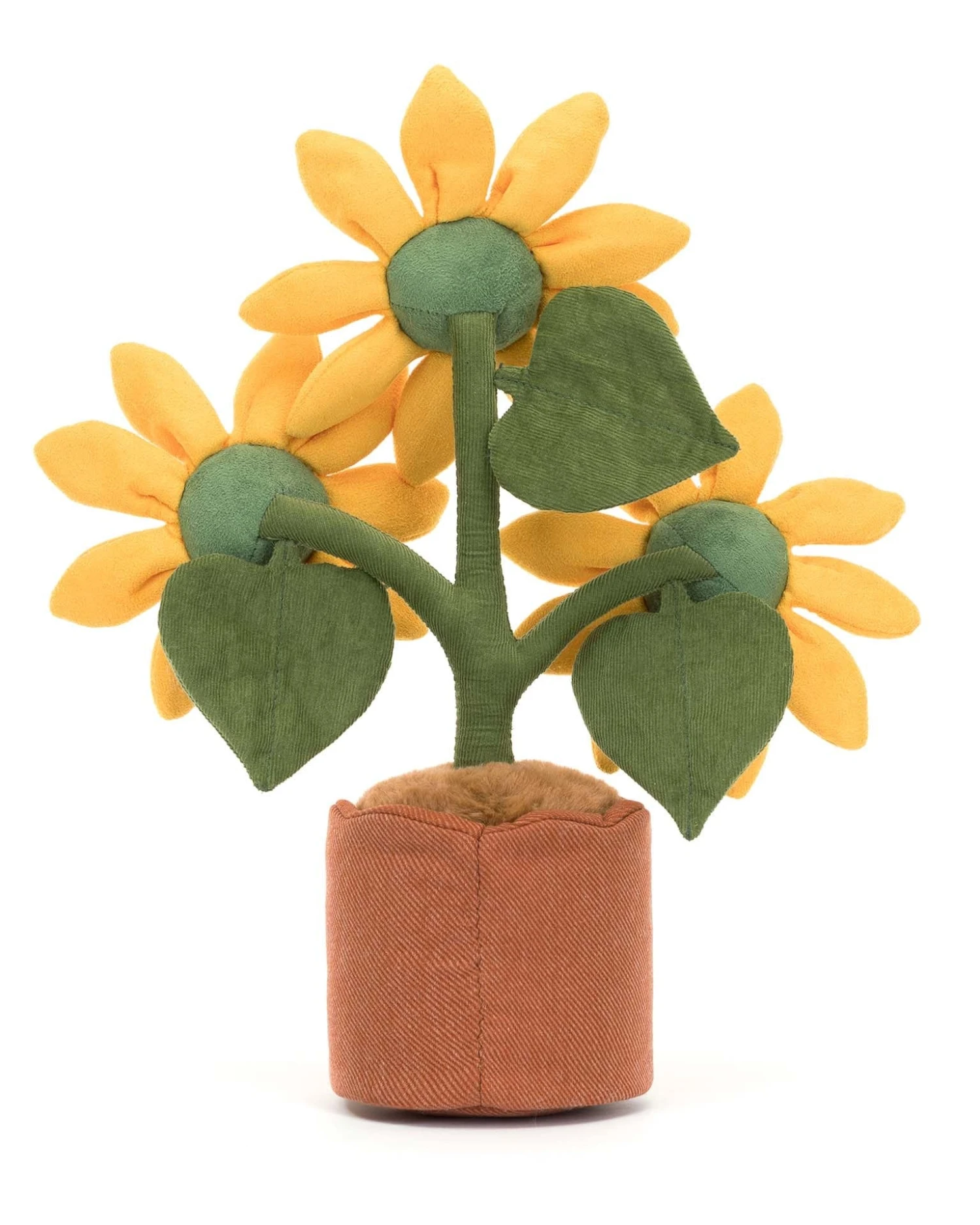 Add a little sunshine to your day with Amuseables Sunflower. This trio of flowers have brown fur faces, bright yellow petals and deep green stalks. Sat in a beautiful brown linen pot with mocha soil, these bright flowers make every day a little sunnier.
