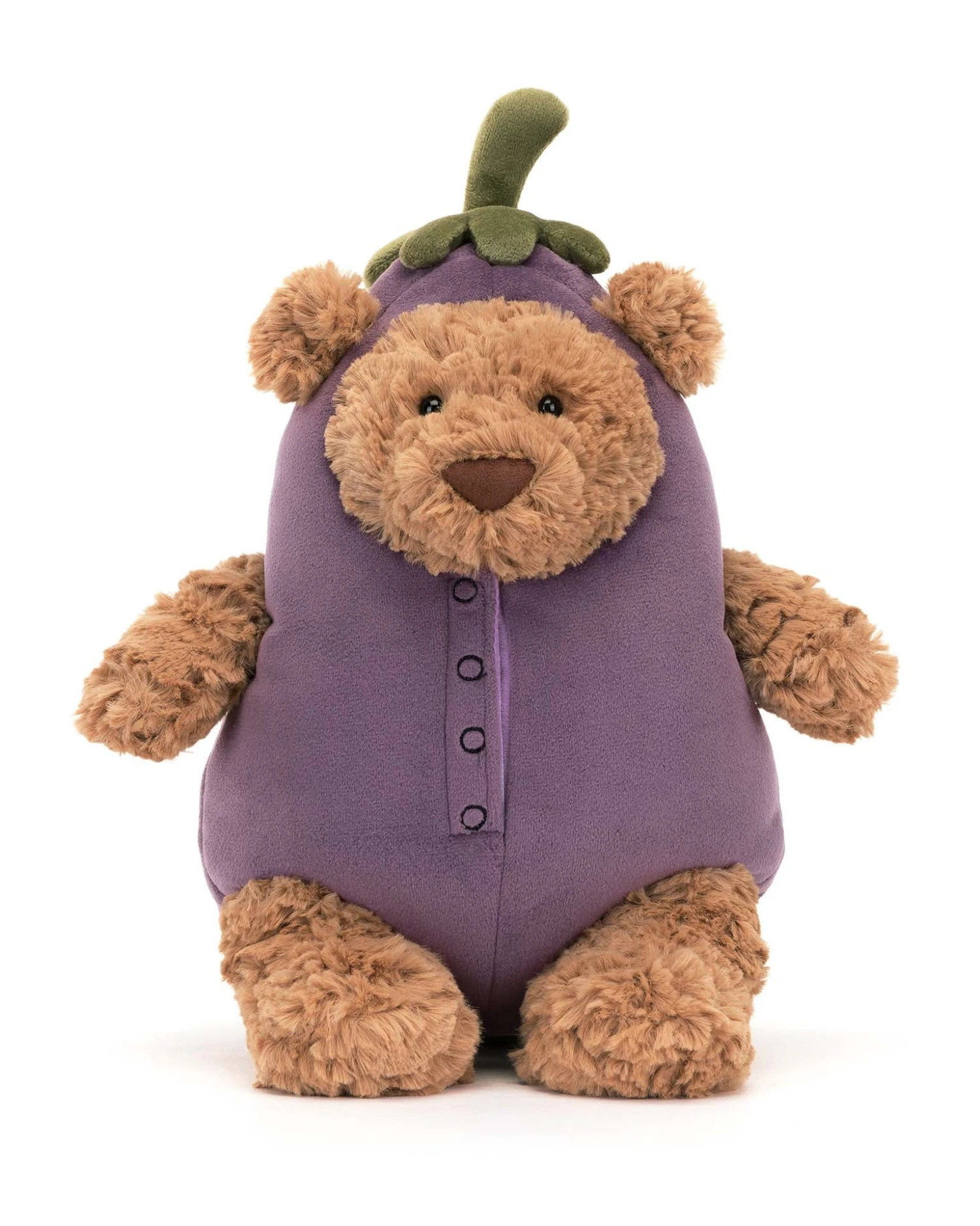 Bartholomew Bear Aubergine is all dressed up! Our toffee bear wears a purple suedette costume, fastened with velcro for easy removal. The veggie suit has stitched faux-summarys and the cute stalk hate even has ear-holes! A kooky gift for a veggie friend or any Bartholomew fan.