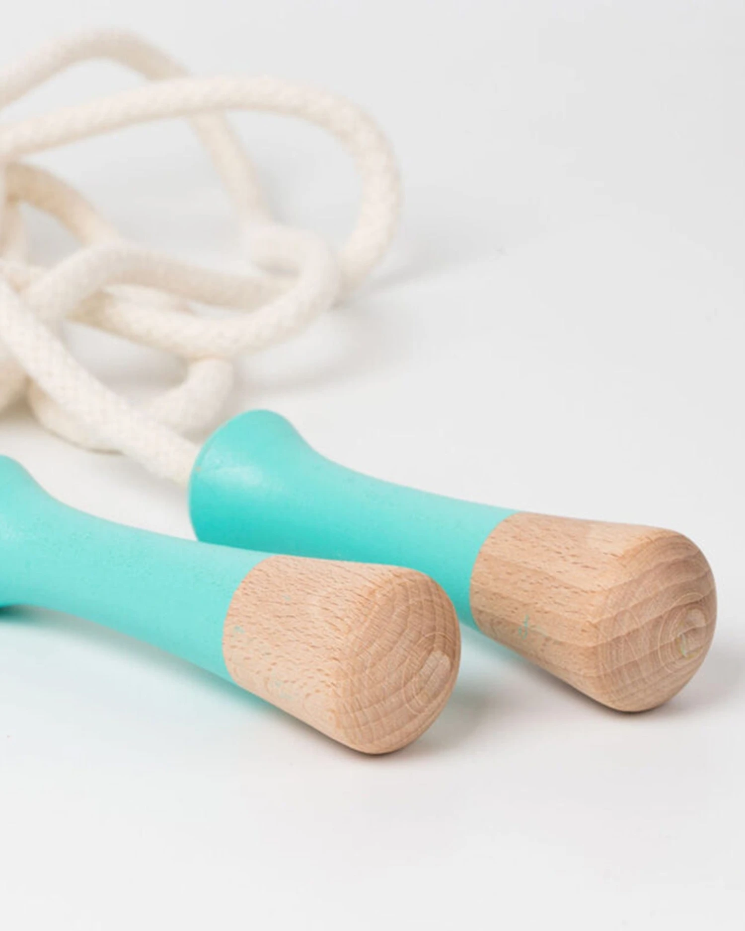 Make memories galore with this sweet jump rope from Me & Mine. Not only is jump rope a complete physical experience (hello, adrenaline release!), it also fosters moments of rhythmic happiness through individual practice and group play. Featuring 6.5′ of natural cotton rope, 5″ environmentally sourced beech wood handles and ecological paint, this piece is as beautiful as it is fun!