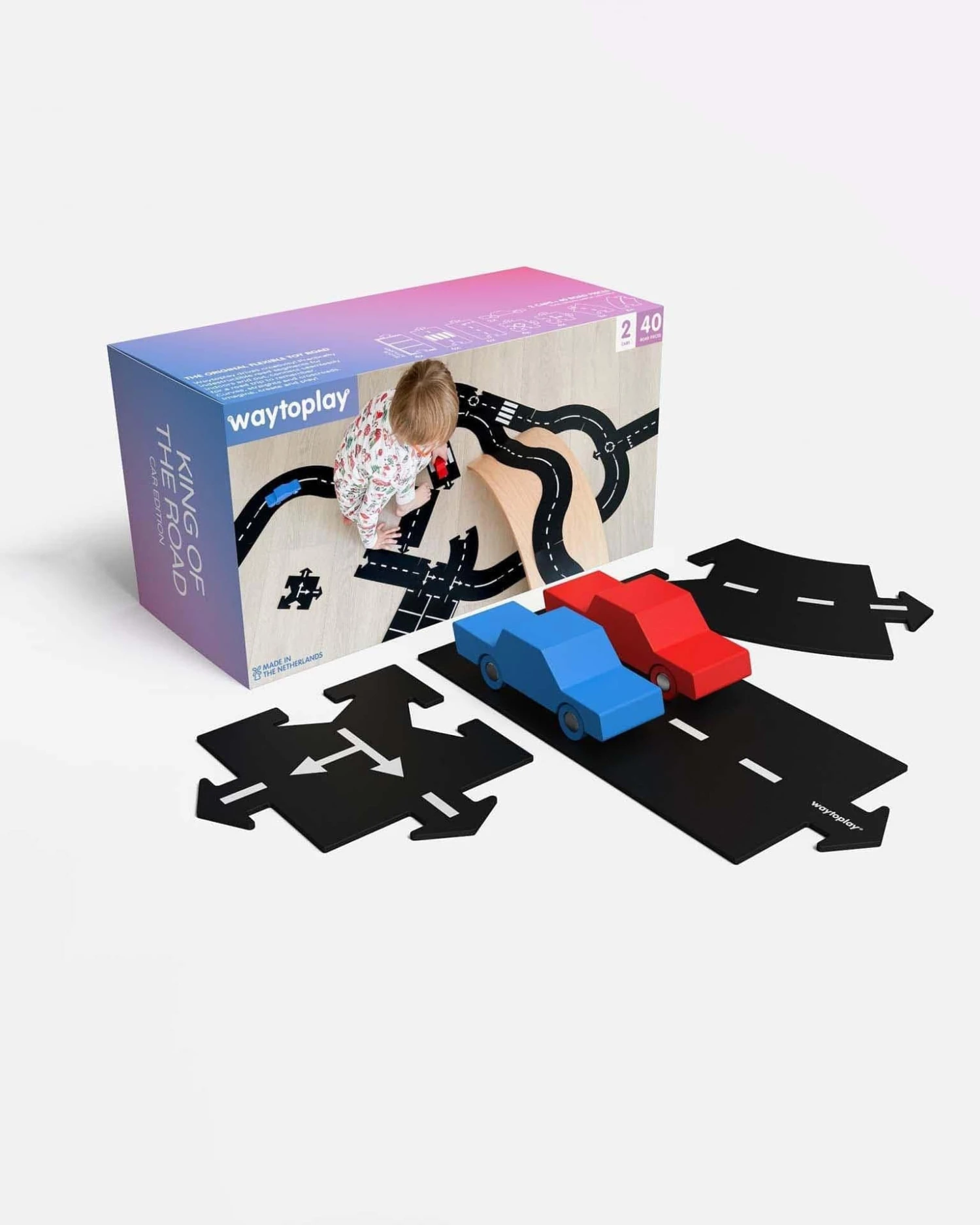 Waytoplay’s King of the Road Extra Long Set will provide endless fun for your little! Including forty road parts and two cars, this set has everything you need for maximum fun. These roads can be played with at home, at the beach, or in the park! Don’t forget to add on an Extension Set for an extra special touch.