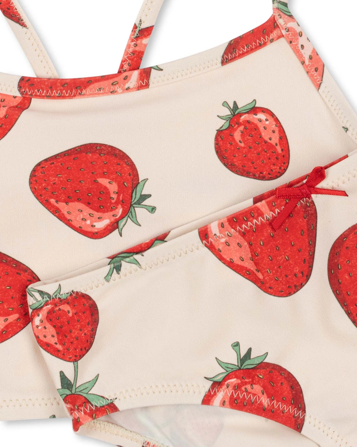 The Frago bikini is made of stretchy, comfortable fabric and features the sweetest strawberry print.