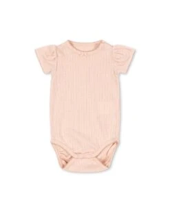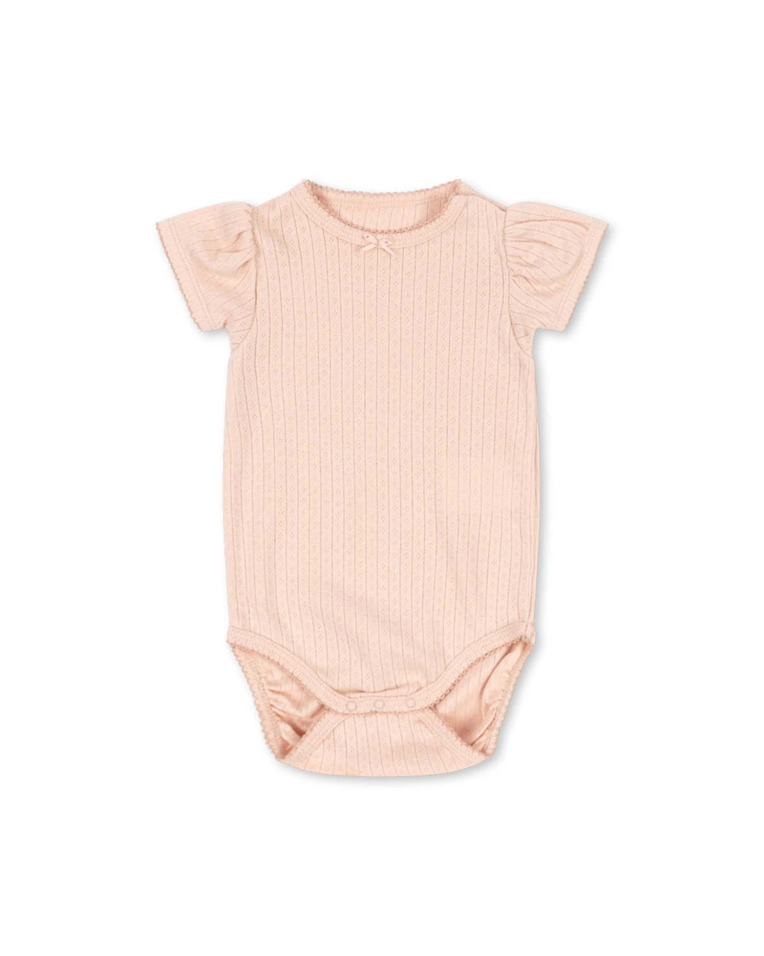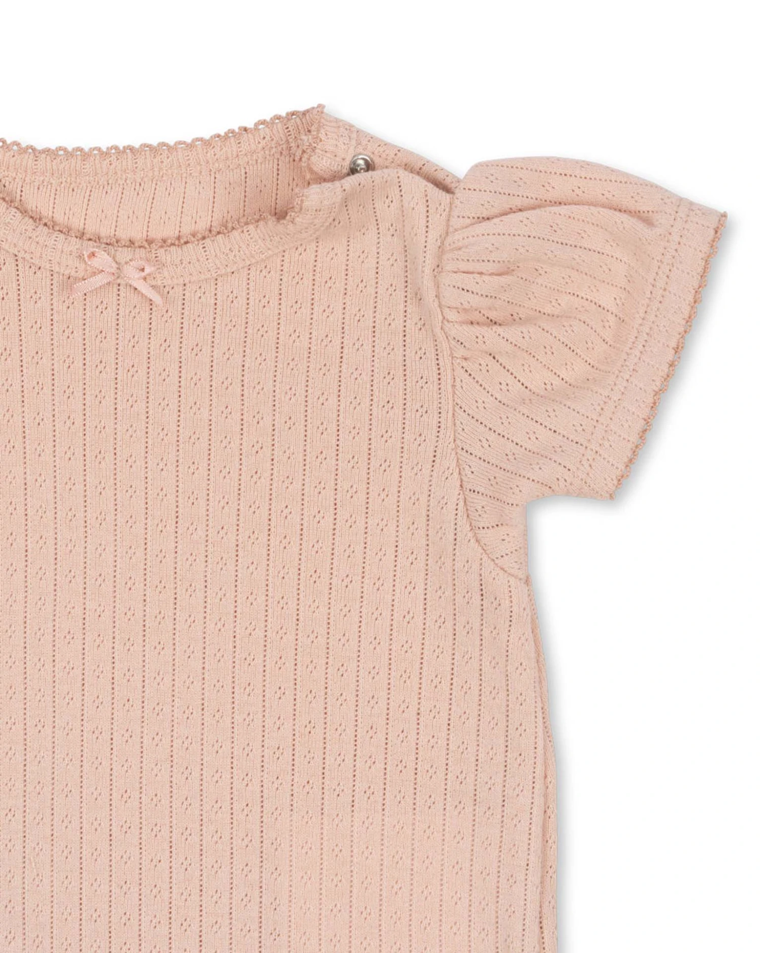 This soft cotton body with decorative pointelle and puff sleeves is designed with summarys at the shoulder for easy dressing.