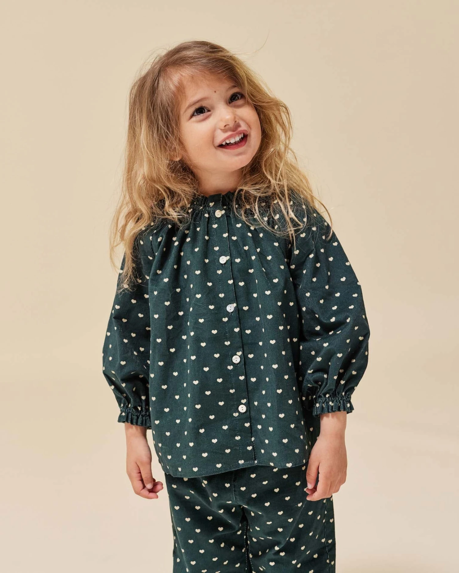Introducing the pen shirt from Konges Sløjd! With small cream hearts and ruffle trim, this shirt is so sweet. Pair it with a skirt or pants for any occasion.