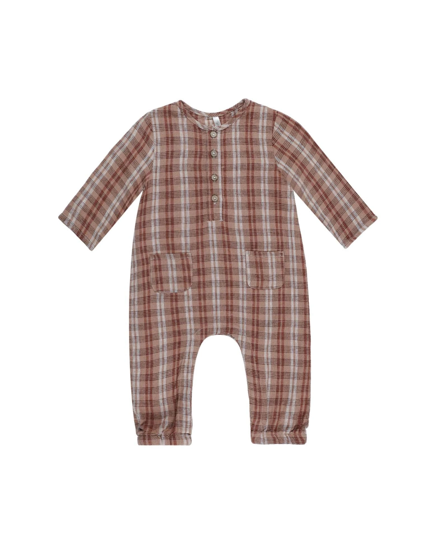 Long sleeve jumpsuit with coconut summarys down the chest, and hidden snaps along the inseam for easy changing. Elastic at leg openings for the perfect fit.