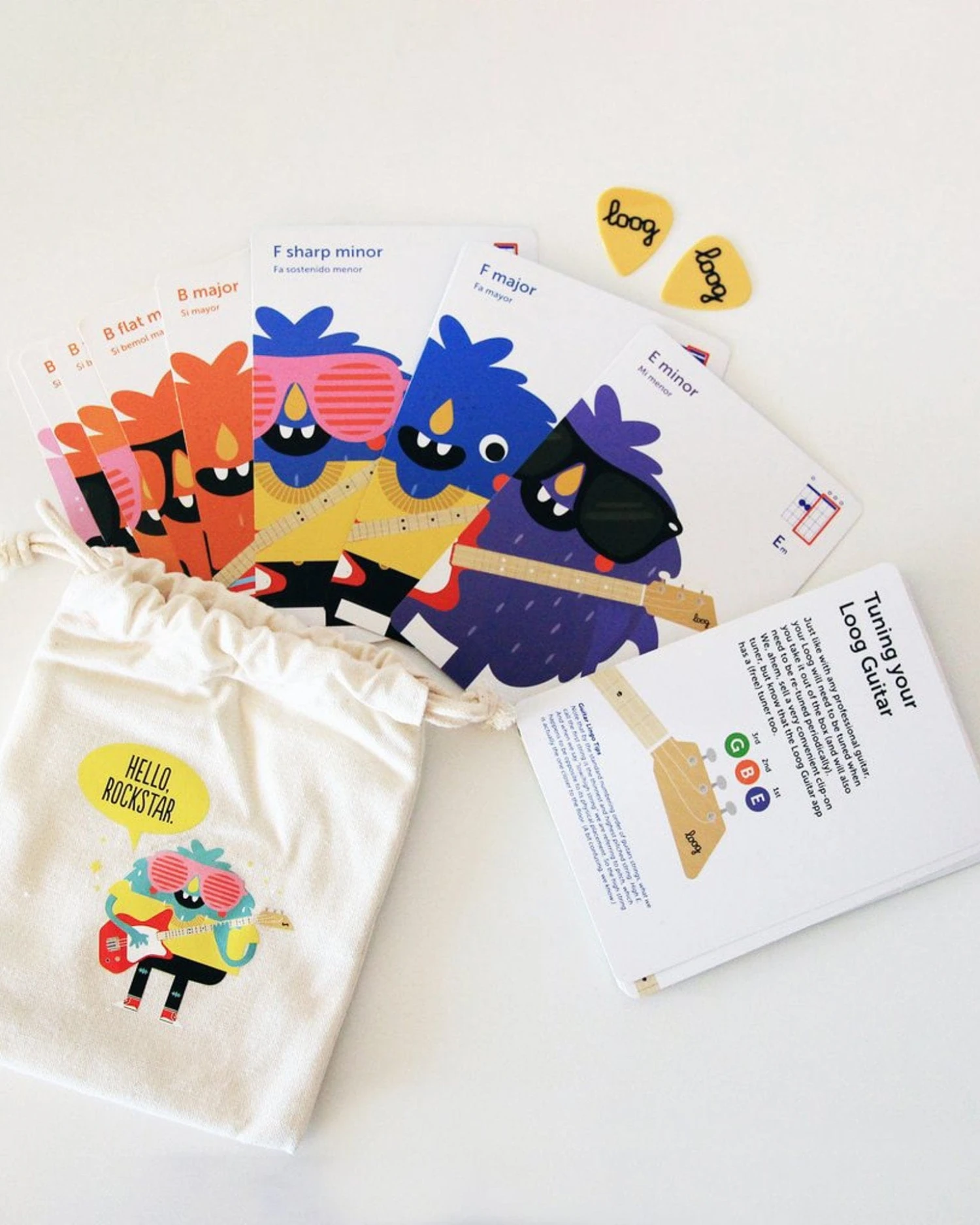 - Includes guitar, picks, flashcards and a download code for the Loog app