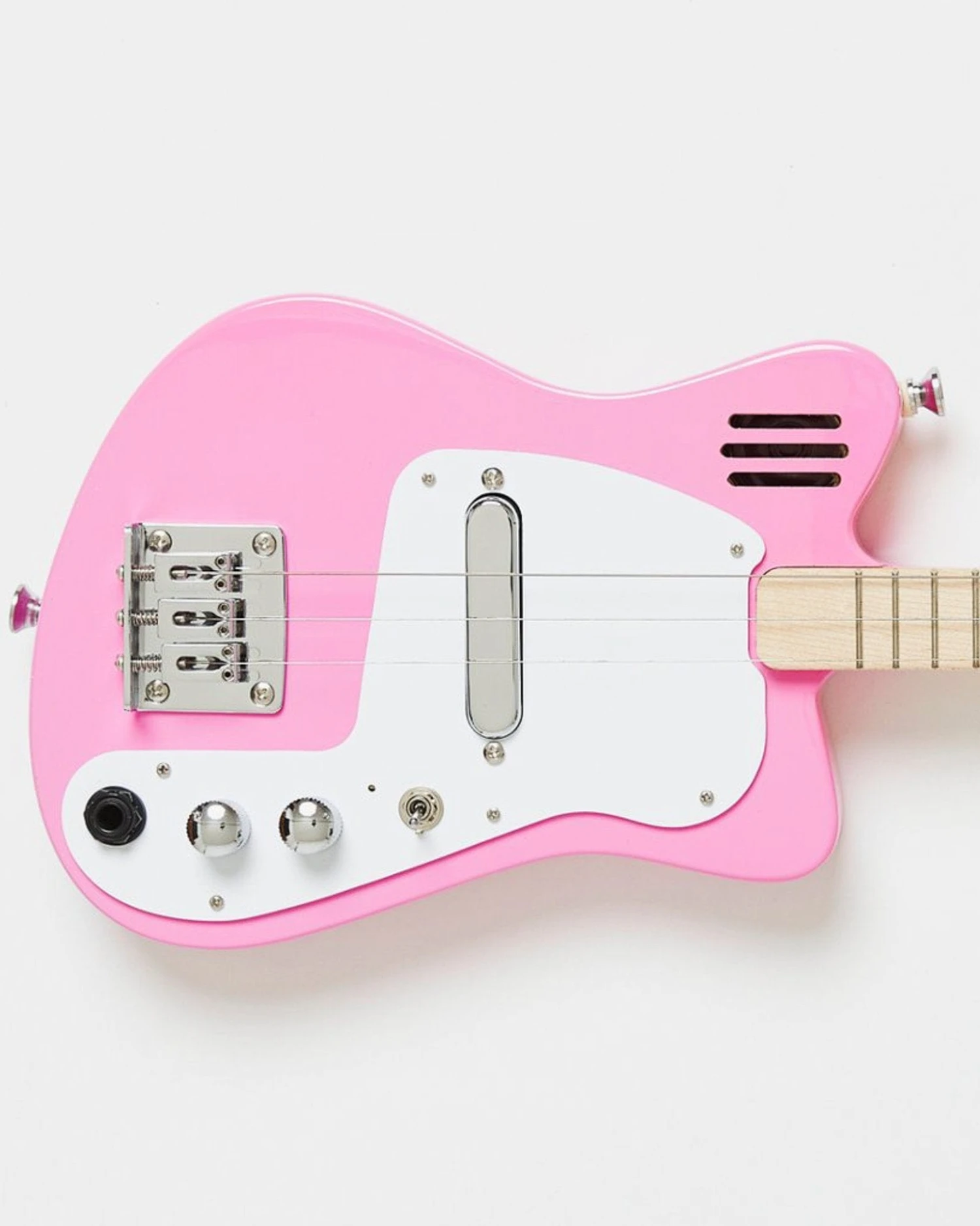 The Loog Mini Electric is a tiny 3-string electric guitar, about the same size as a ukulele, with a built-in amp and speaker! It comes bundled with flashcards, an app that teaches you music through AR and free video lessons.