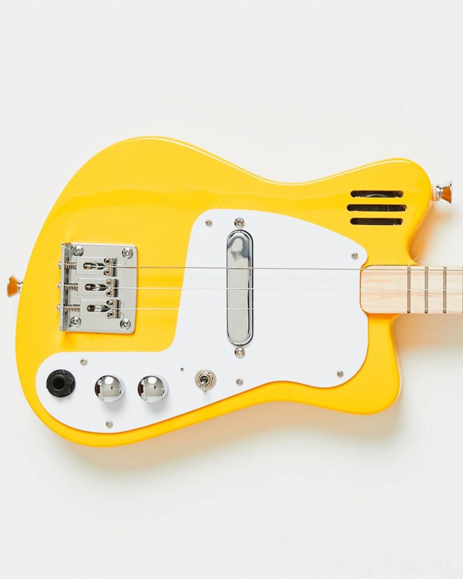 The Loog Mini Electric is a tiny 3-string electric guitar, about the same size as a ukulele, with a built-in amp and speaker! It comes bundled with flashcards, an app that teaches you music through AR and free video lessons.