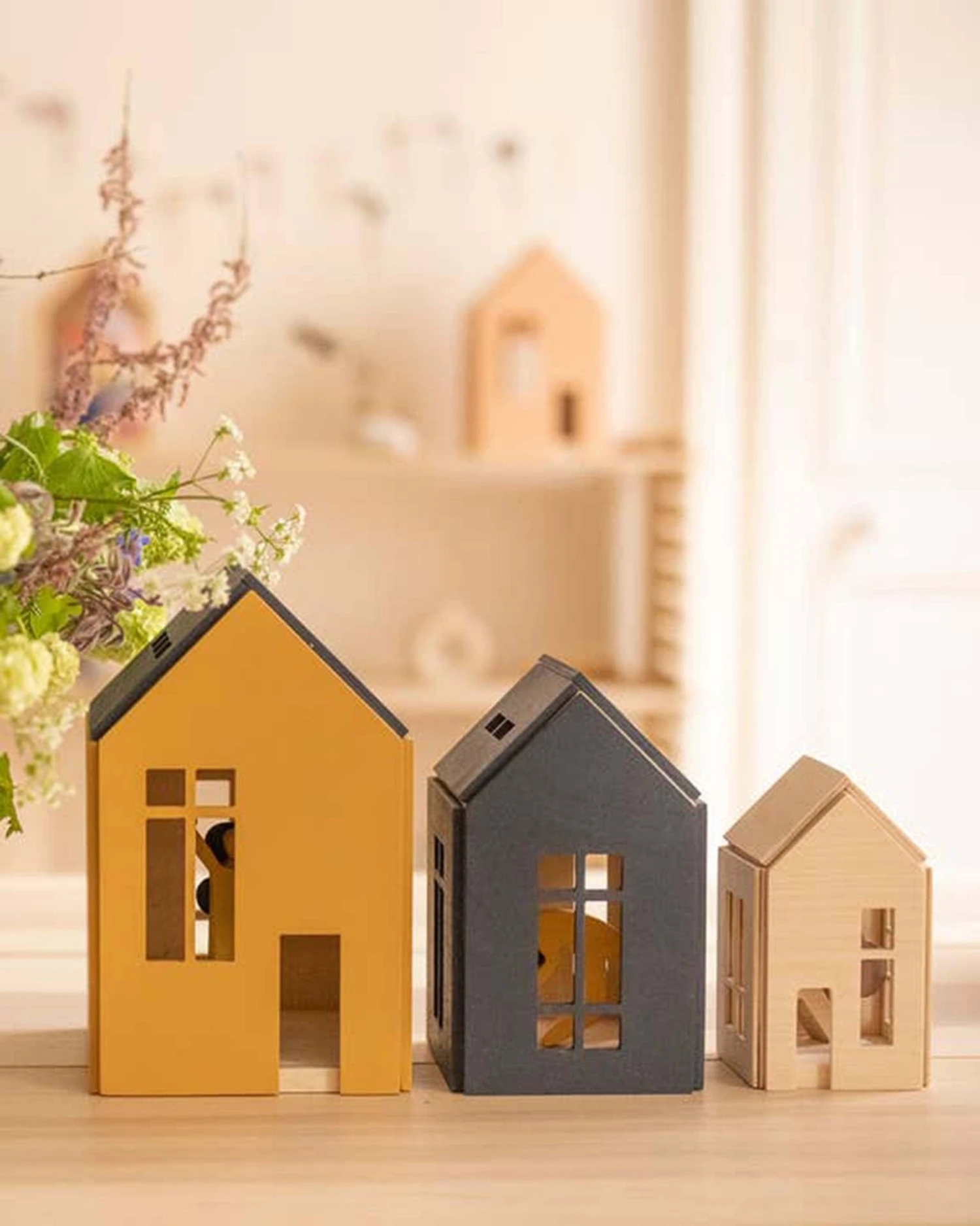 This set of 3 beloved wooden dollhouses on the magnets can be combined together as rooms or little village for tiny characters.