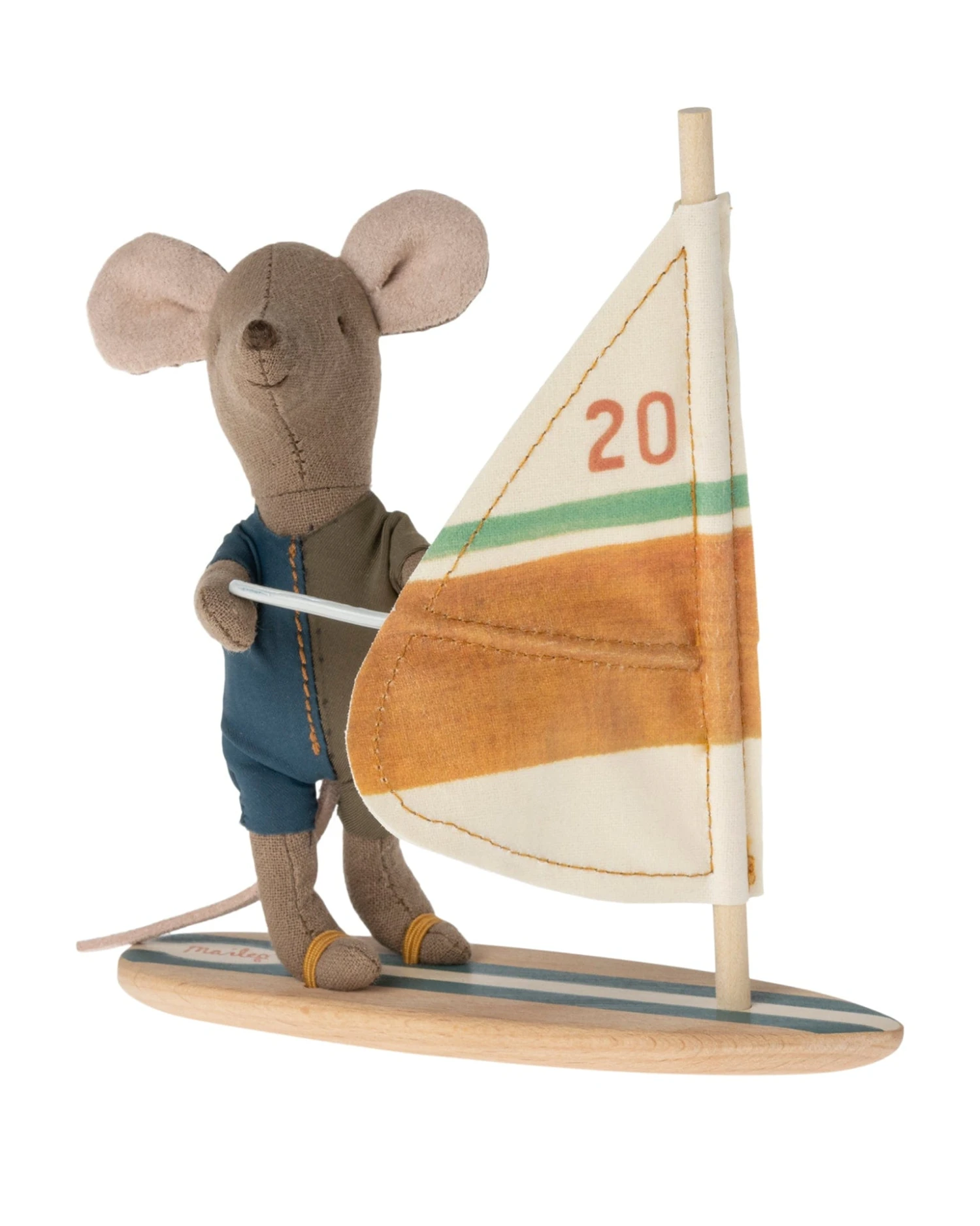 Hit the beach for your favorite watersports with Maileg’s Surfer Little Brother. Wearing a two-tone suit and holding on to his windsurfing board, this Little Brother Mouse is enjoying that summer sun!
