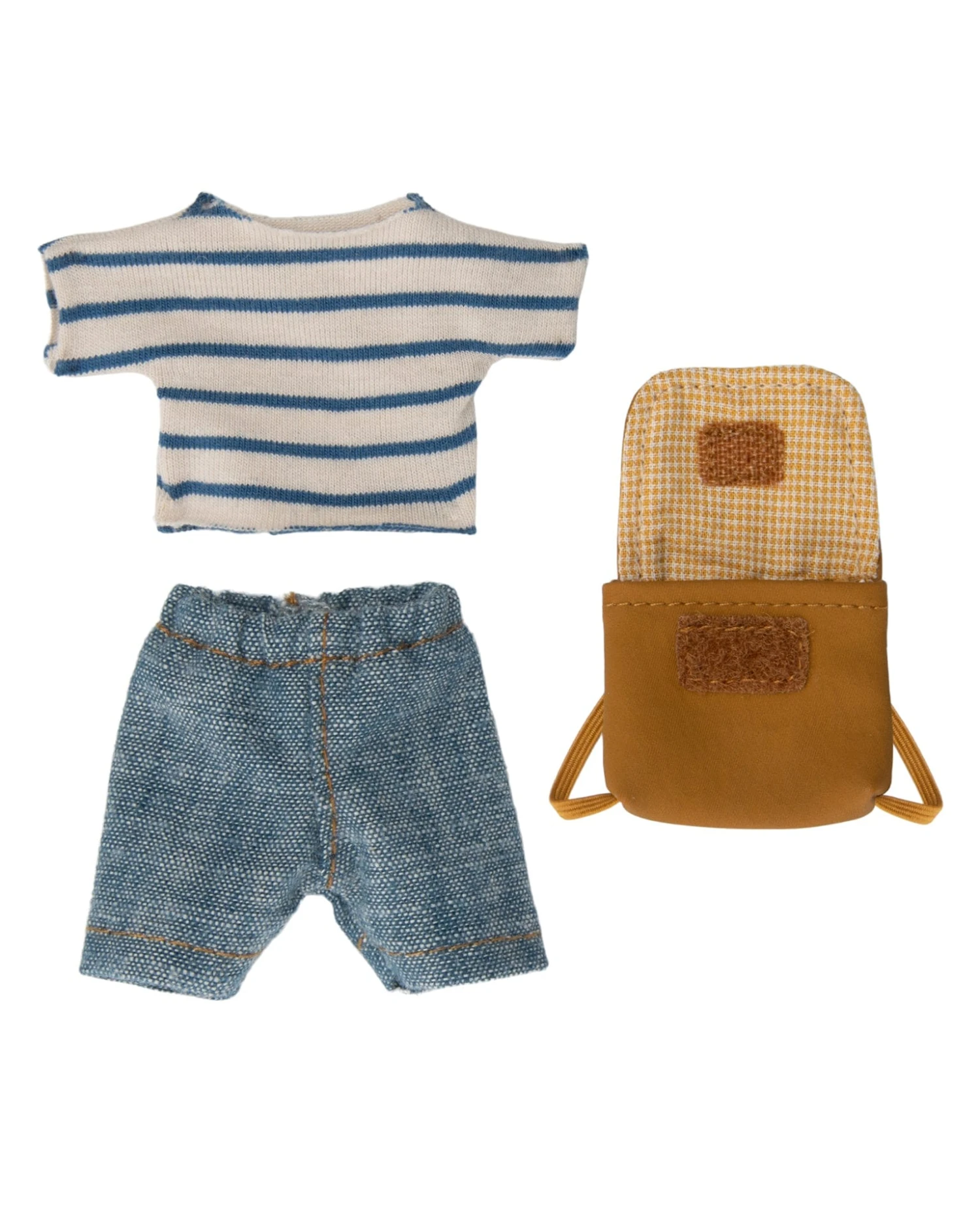 This Maileg big brother mouse is ready to hit the road. Dressed with his backpack, he can use her magnetic paws to hold onto his tricycle as he speeds down the road.