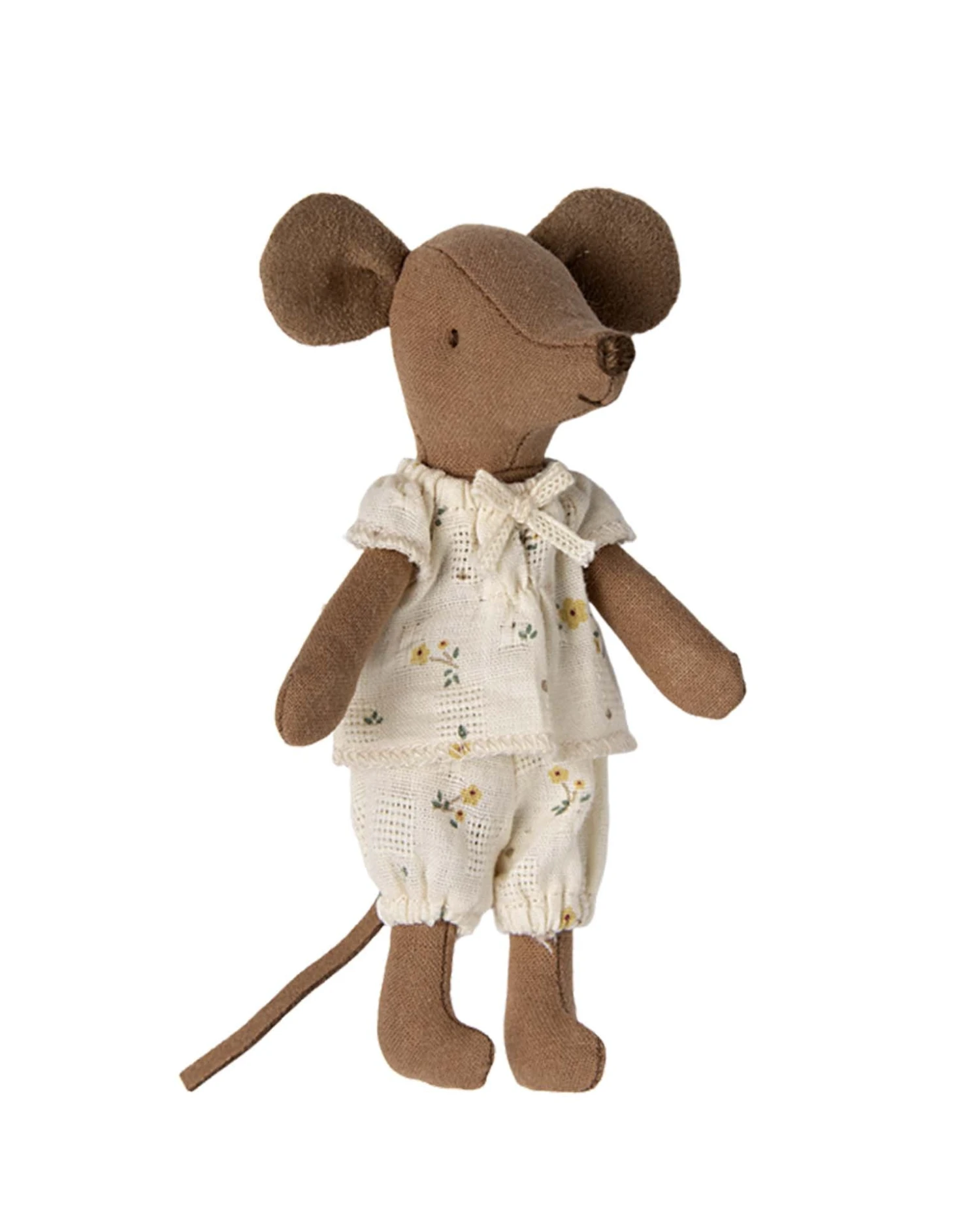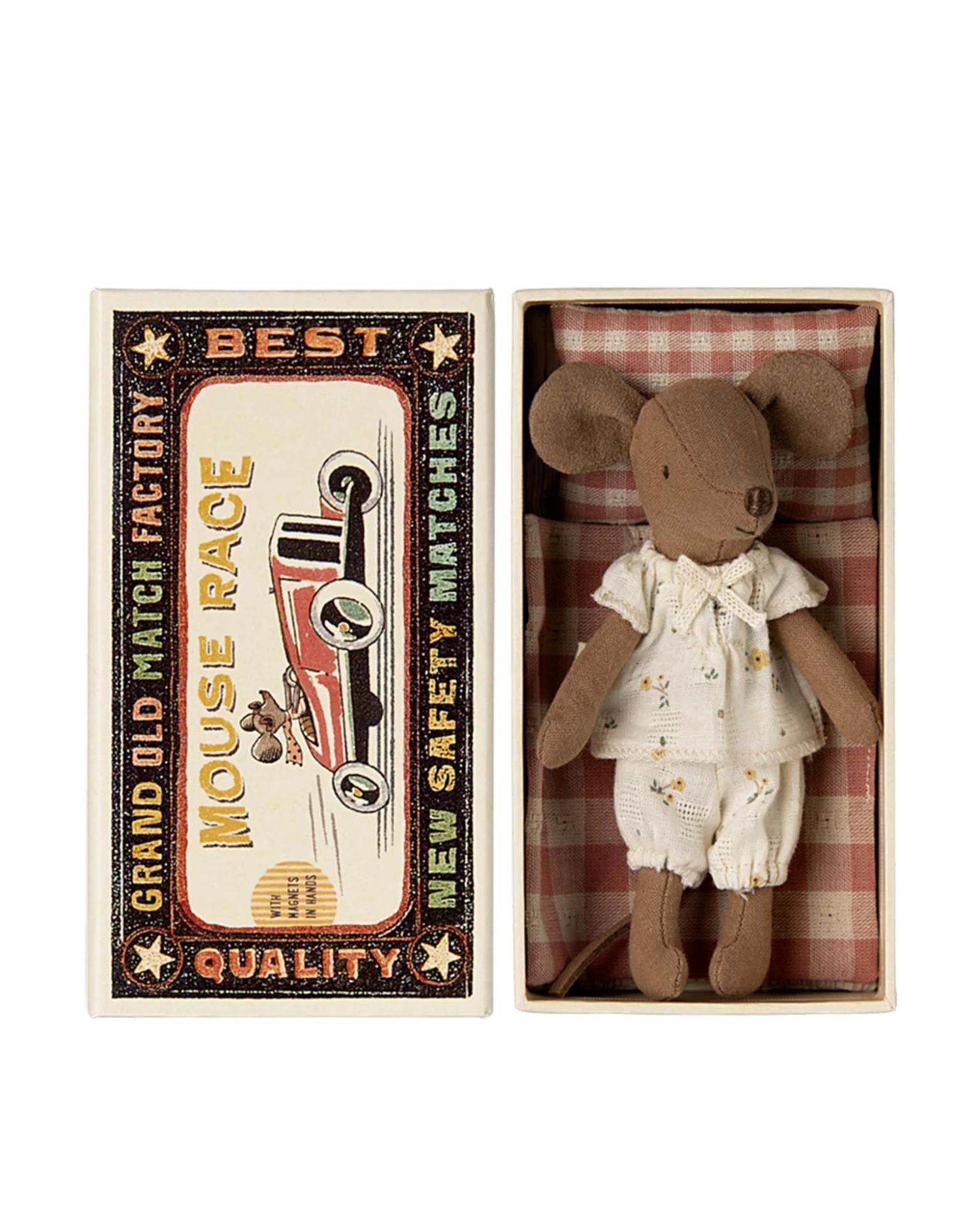A classic Maileg item. This mouse is ready for hours of play and sleeps tight in the little matchbox. The clothes and bedlinen are made of soft fabrics with unique prints in beautiful colors. Extend the story by adding accessories to the play!