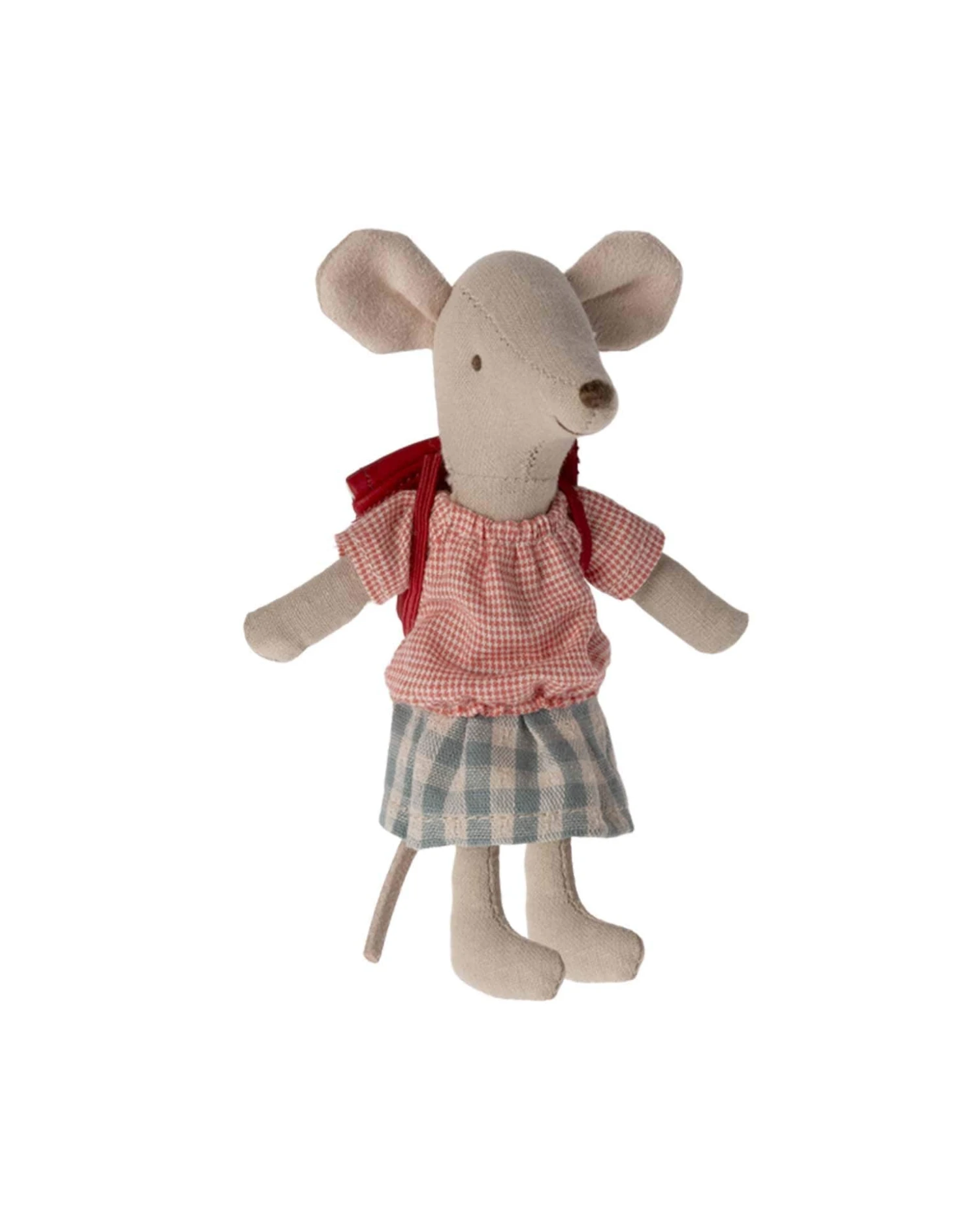A big sister mouse is dressed for a day in kindergarten or school as she is bringing her backpack. She has magnets in her hands so she can hold the tricycle handles tight for the fast trip.