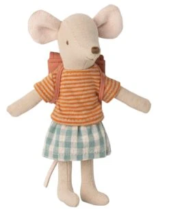 This Maileg big sister mouse is ready to hit the road. Dressed with her backpack, she can use her magnetic paws to hold onto her tricycle as she speeds down the road.