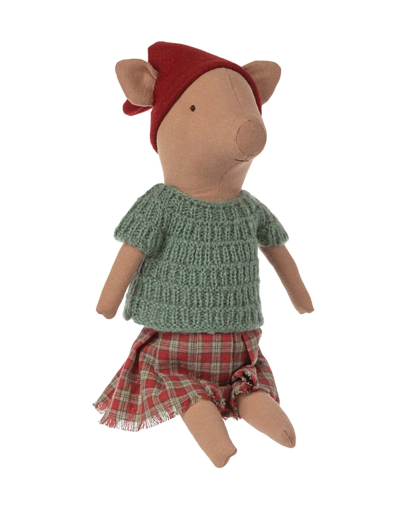 This soft pig is dressed in classic Christmas clothes. It is very beautiful for decoration but also sweet for play during December. Hat is removeable and then the pig can be used all year for any occasion.