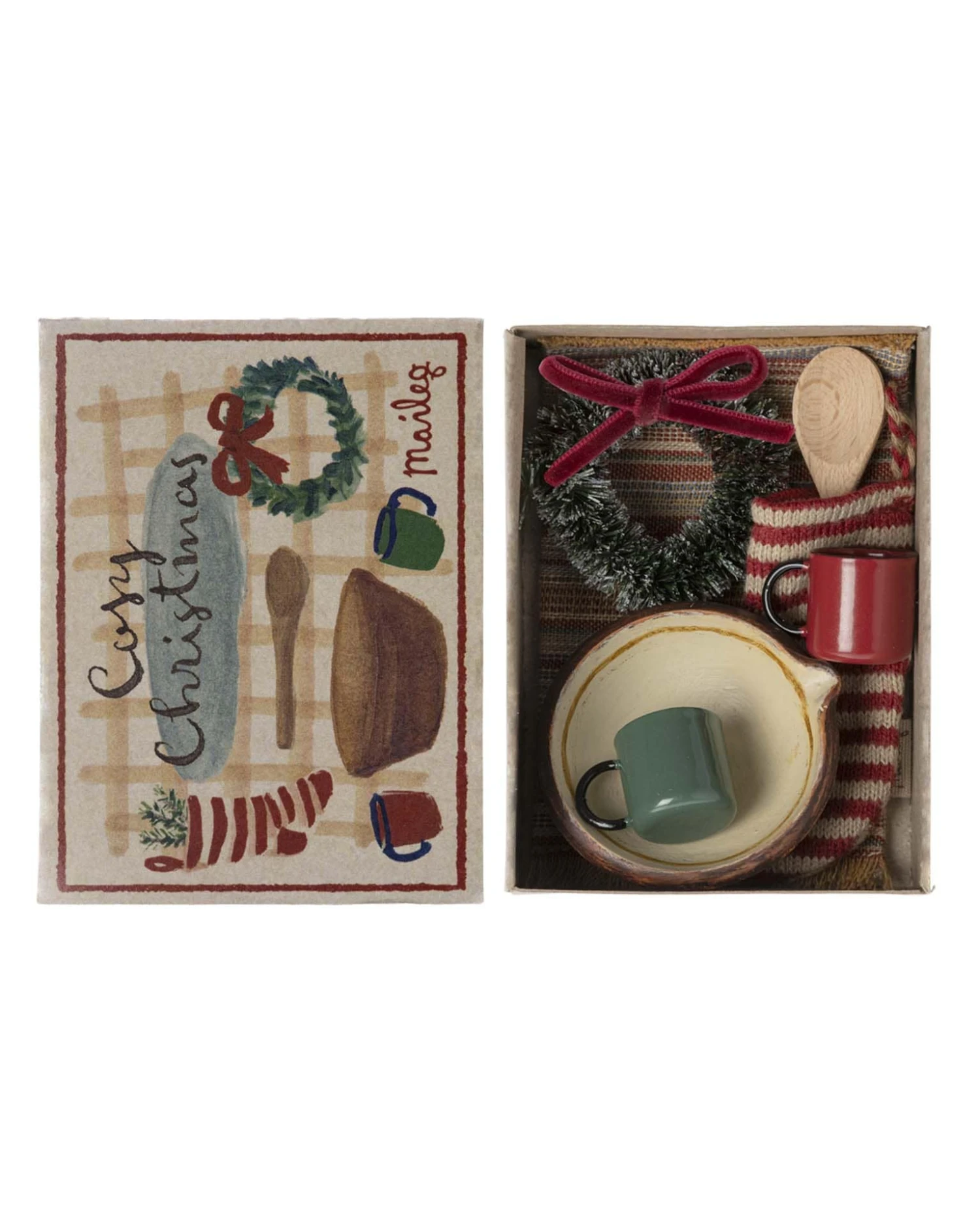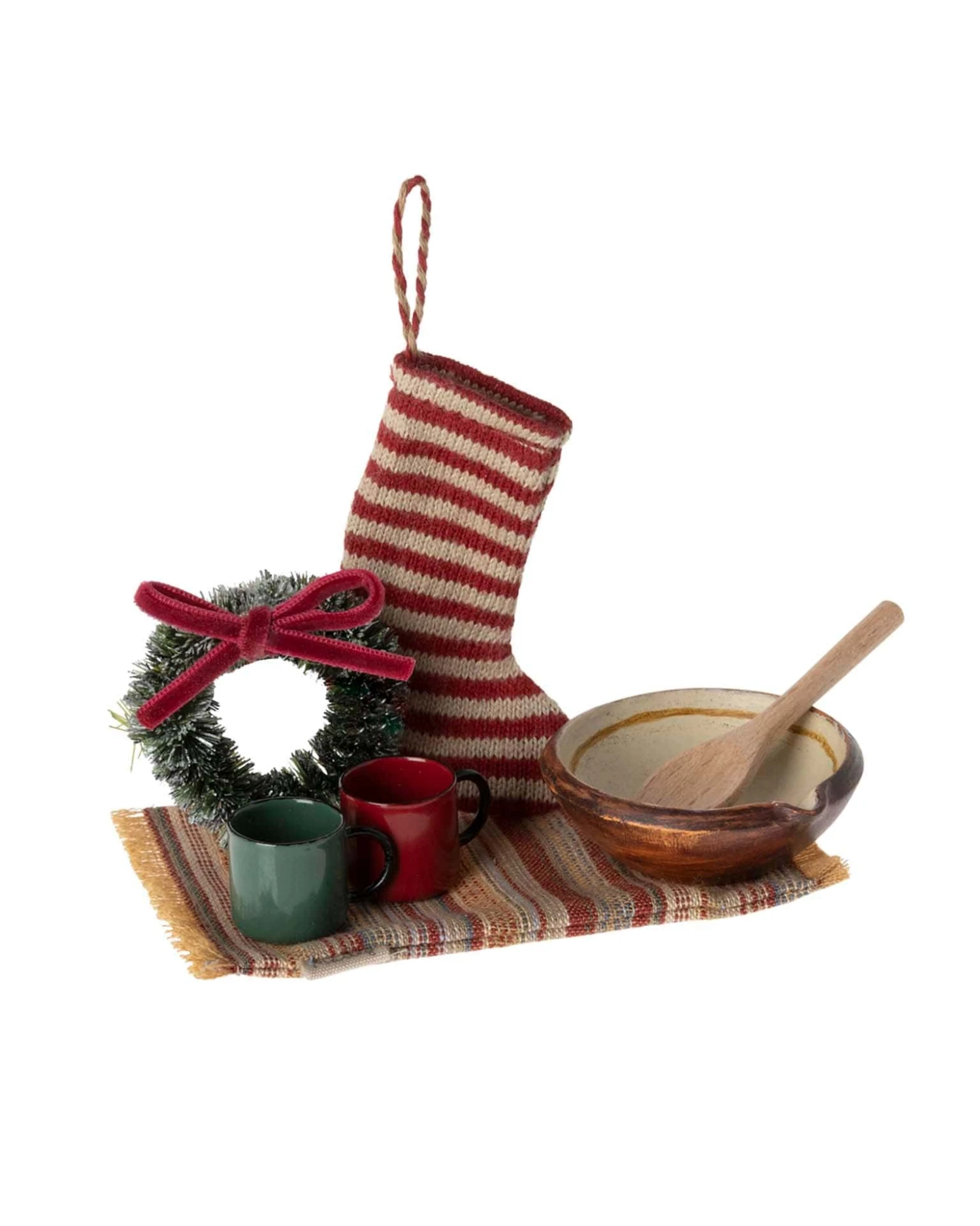 A set with all the necessary accessories for a cozy Christmas time. In the beautiful giftbox, you find a small stocking, rug, wreath, two cups, and a bowl with a wooden spoon. All parts fit into the Gingerbread house and fit for the mouse family.