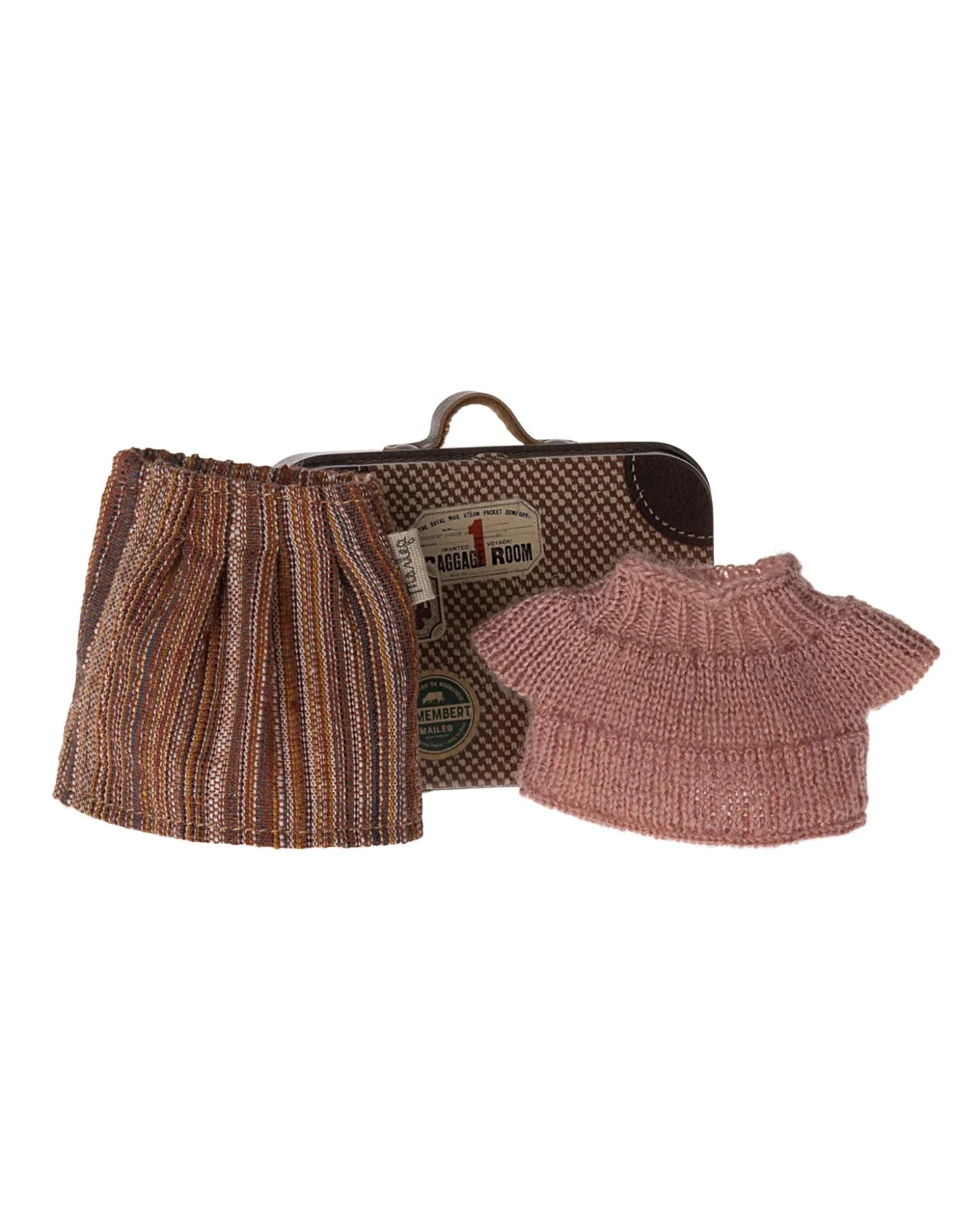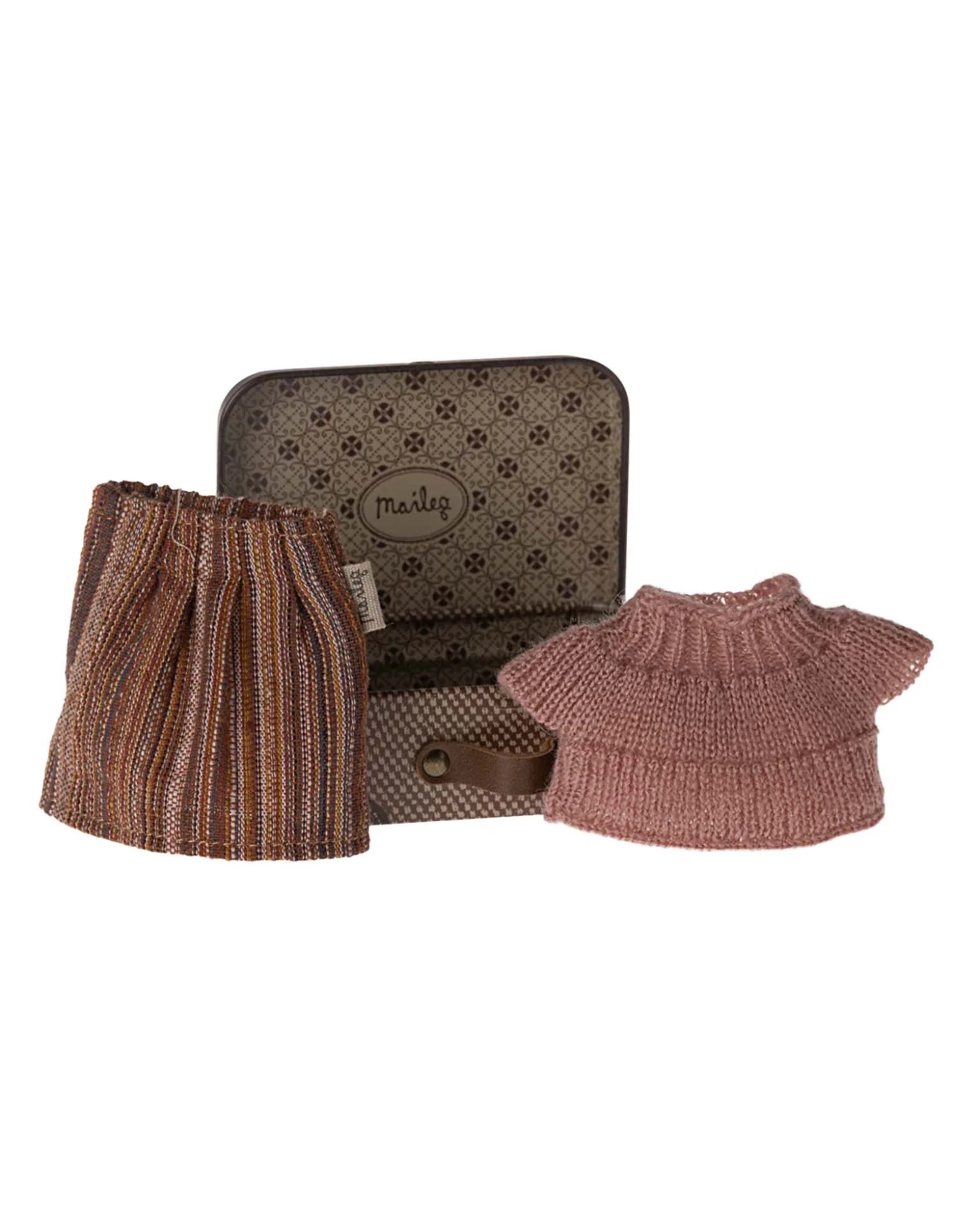 Dress up grandma mouse in this beautiful set of clothes. It is packed in a small metal suitcase which makes it easy to bring on a holiday.