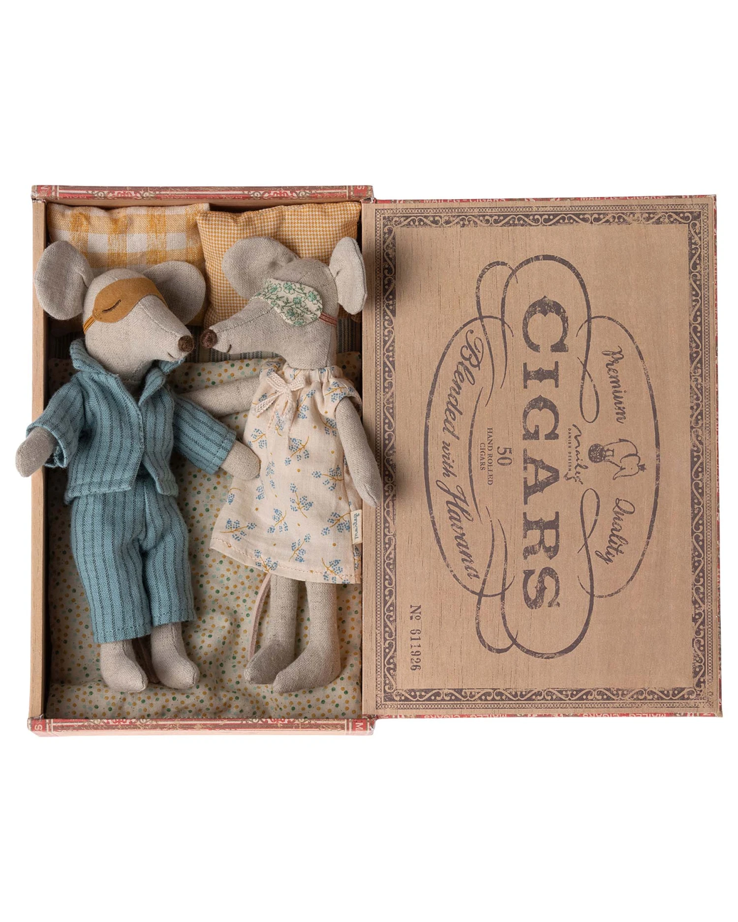 A classic Maileg item. Mum and Dad mice are wearing their beautiful nightwear and eye masks. The cigar box is a perfect bed for a good night’s sleep and sweet dreams. Bed linen may vary in color.
