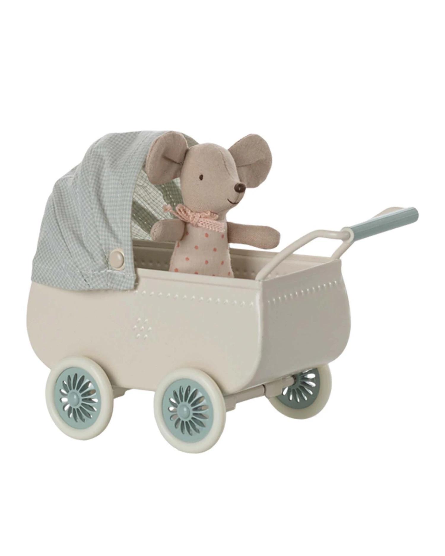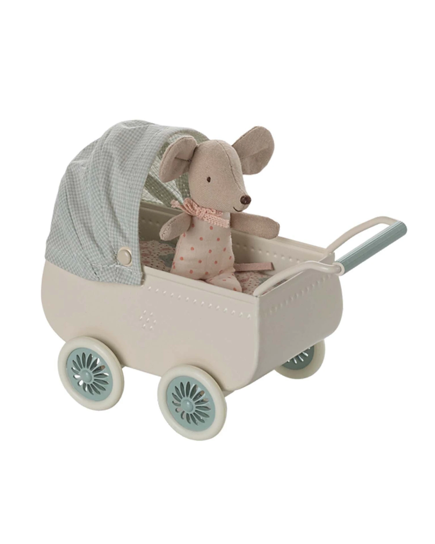 The beautiful pram has a vintage look and comes with a small mouse in a sleeping bag. The mouse is laying on a soft mattress in the pram and will sleep for hours.