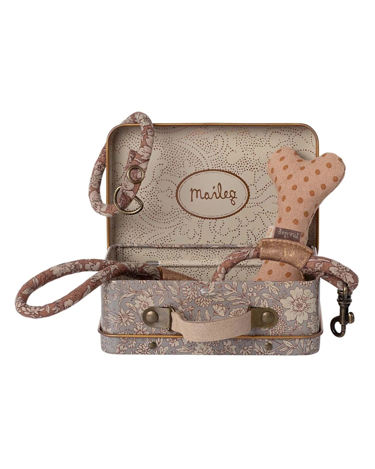 This set is all you need for your soft plush dog. The set includes a bone, collar and leash packed nicely in a metal suitcase with a beautiful Maileg print.