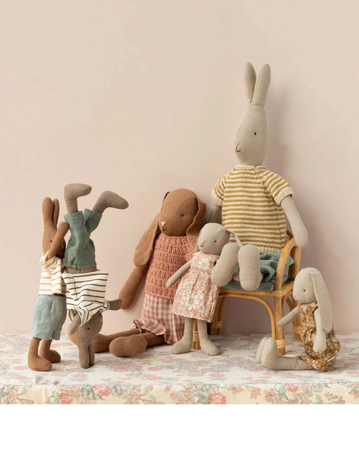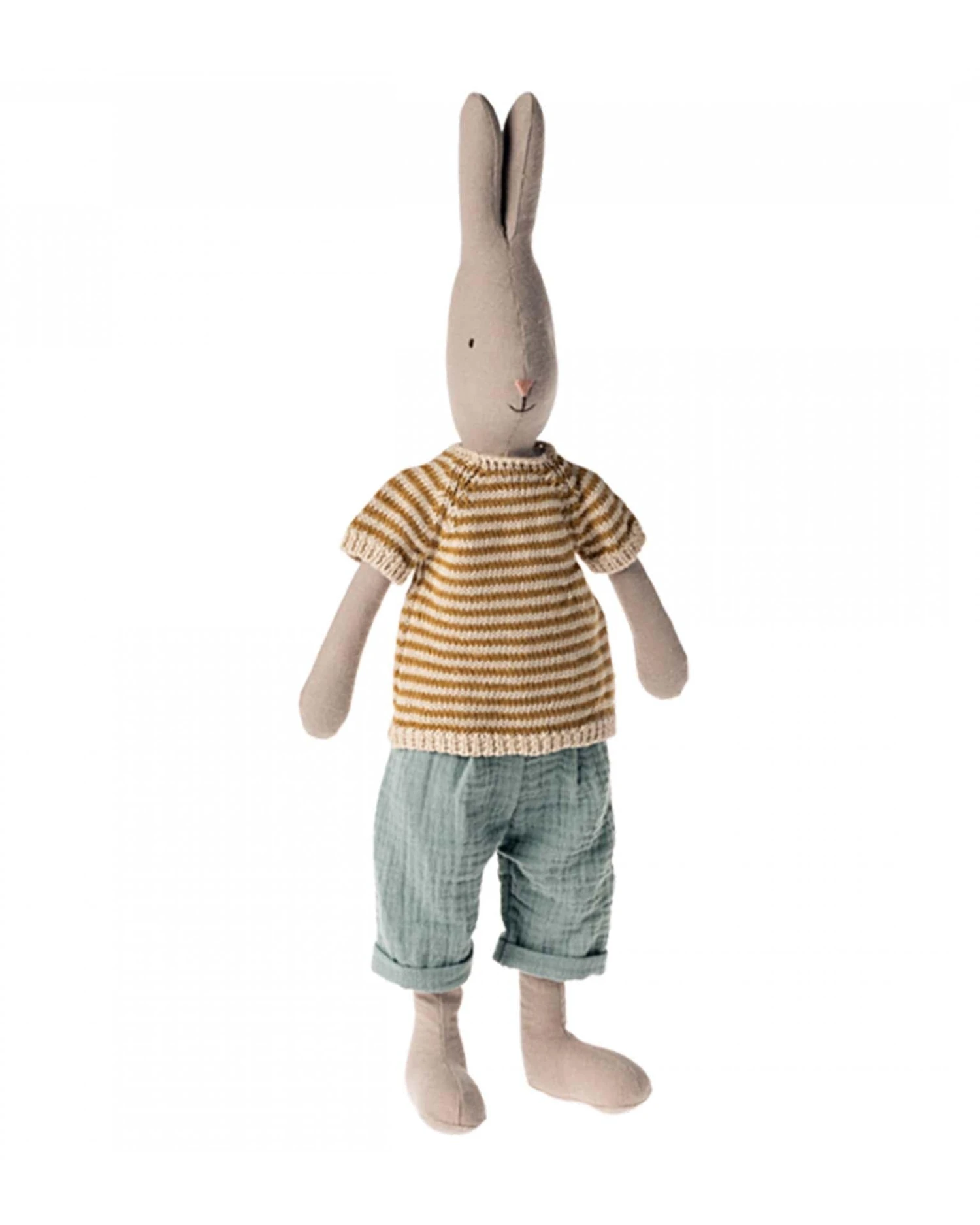 A classic rabbit made of soft natural fabrics that gives a lovely hand feel and look. He is dressed up in pants and a soft knitted shirt. Check out our clothes collection to expand the rabbits’s wardrobe.