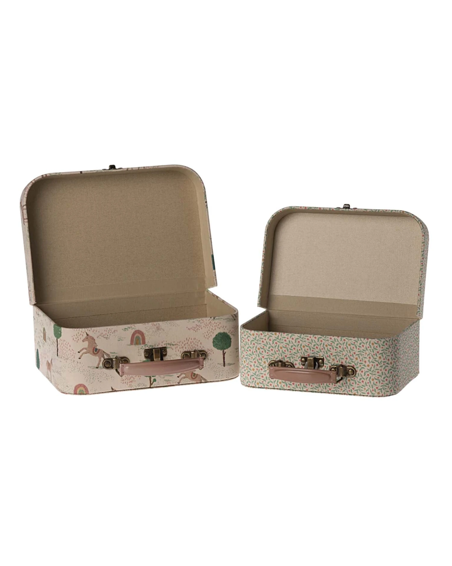 A perfect suitcase set to store all your favorite items. Each suitcase is covered by unique Maileg fabrics and has colored metal handles. This 2 pcs set is perfect both for storage and for carrying your favorite toys in.