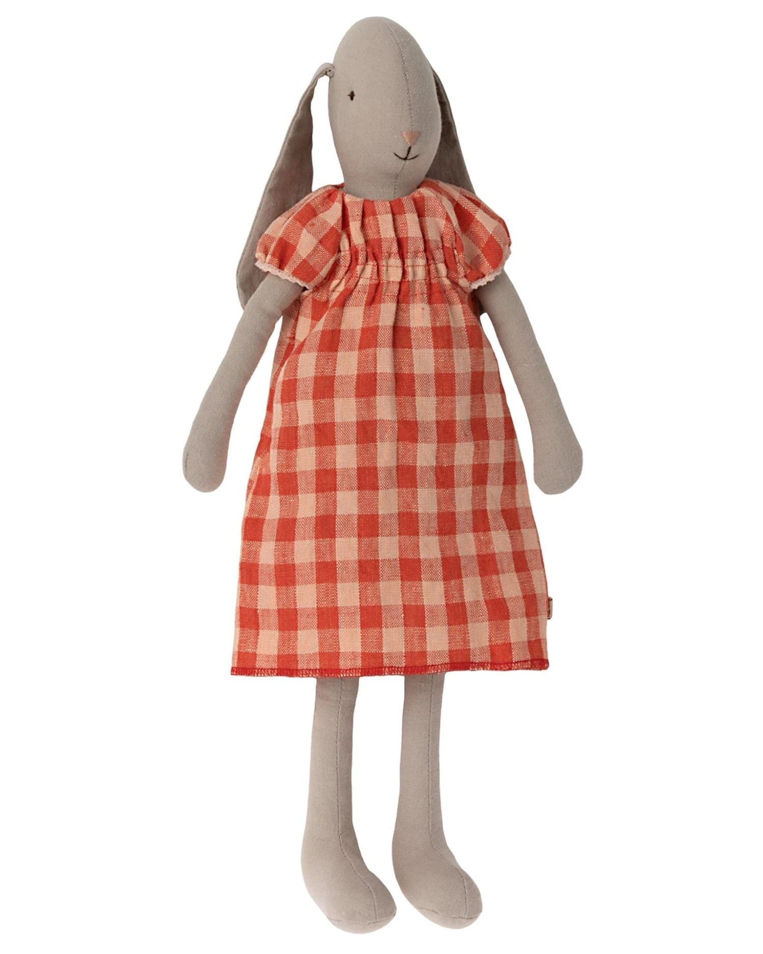 Maileg’s bunny and rabbit collection is made from soft natural linen and cotton fabrics which gives these stuffed friends a lovely hand feel and look. This rabbit is dressed in a bright checked dress.